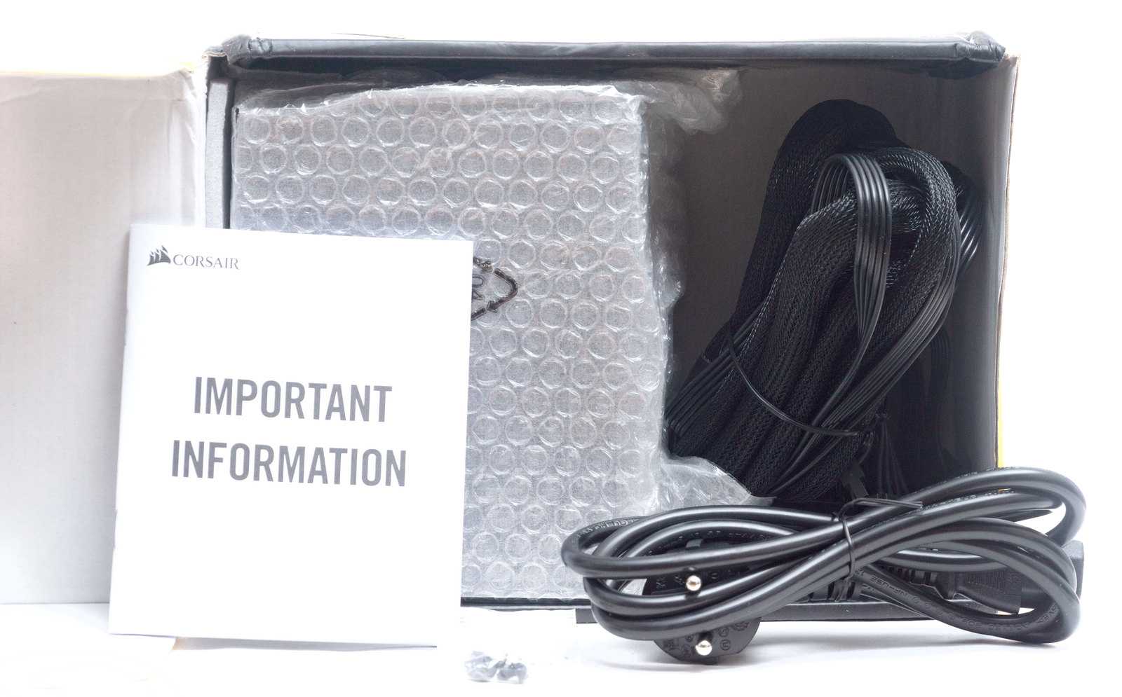Вместе с блоком питания Corsair приложила: кабель питания от сети, кабели питания компонентов, винты монтажа и гарантийный листок.