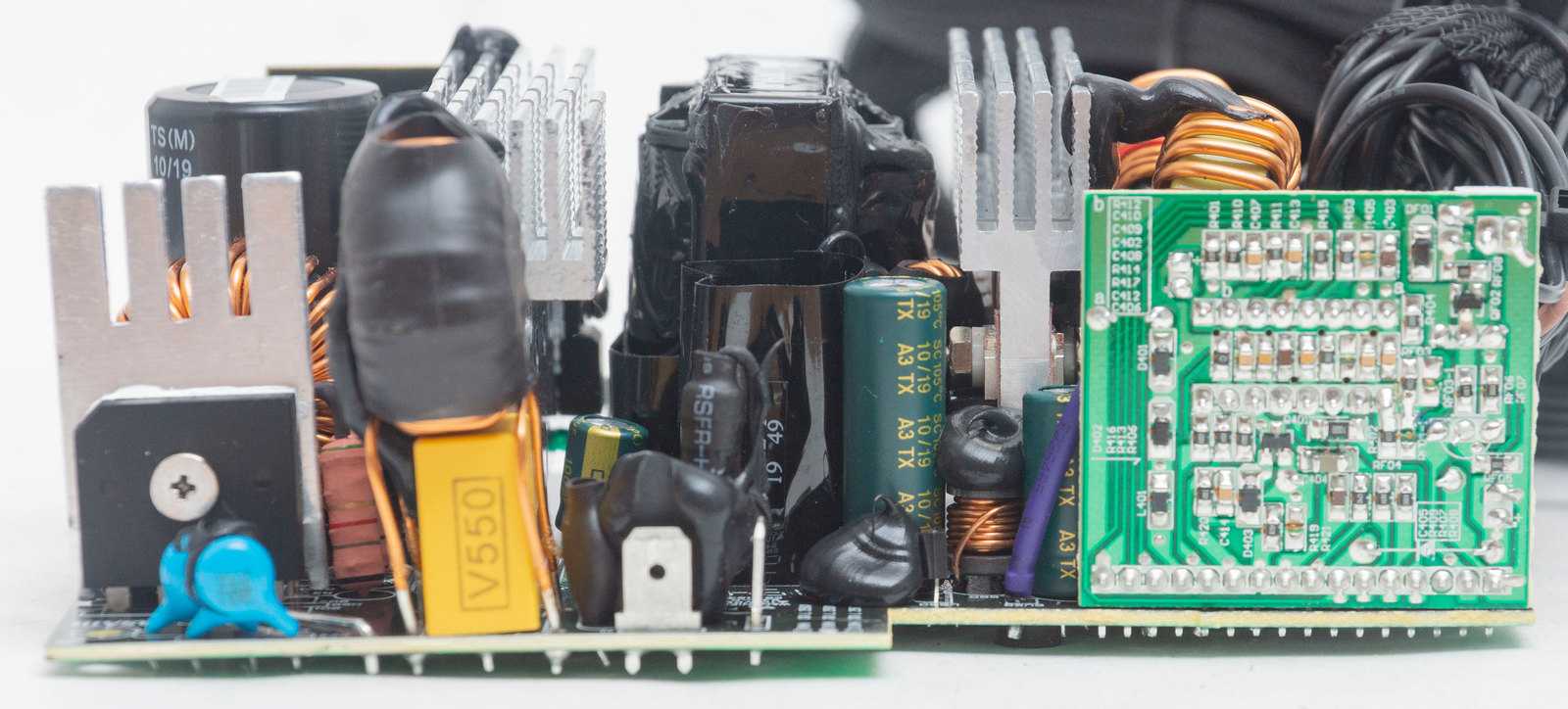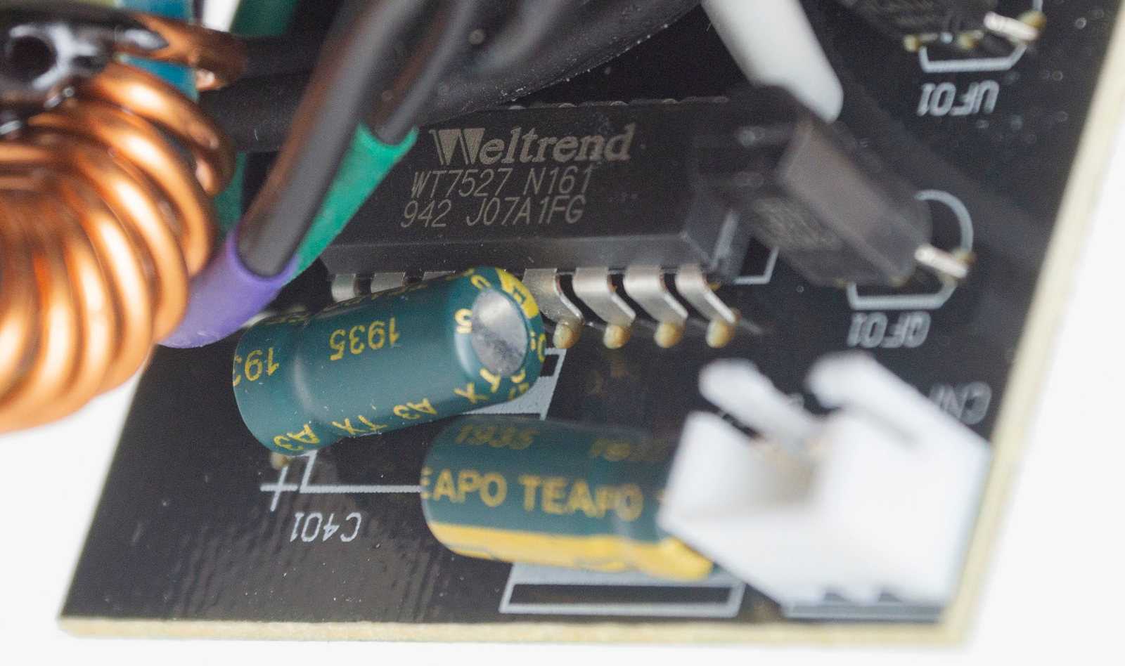 На еще одной вертикальной плате размещен супервизор Weltrend WT7527, он занимается контролем выходных напряжений, защищает от перегрузок и коротких замыканий. К этой же плате подключается вентилятор.