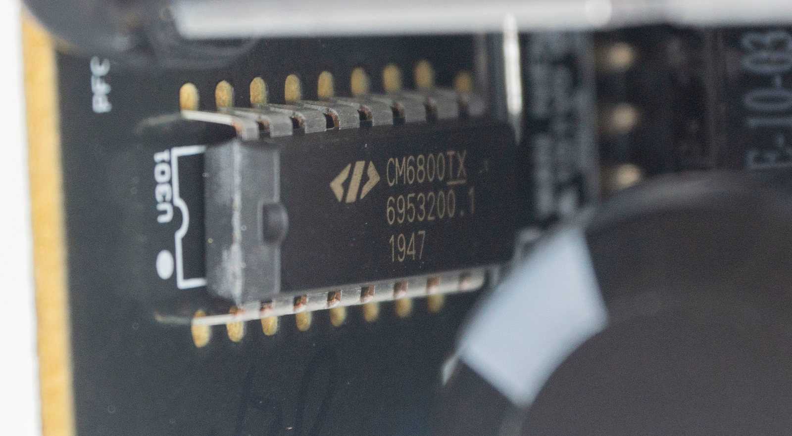 Рядом на дополнительной вертикальной плате находится контроллер CM6800TX, с обратной стороны — еще один с нечитаемой маркировкой.