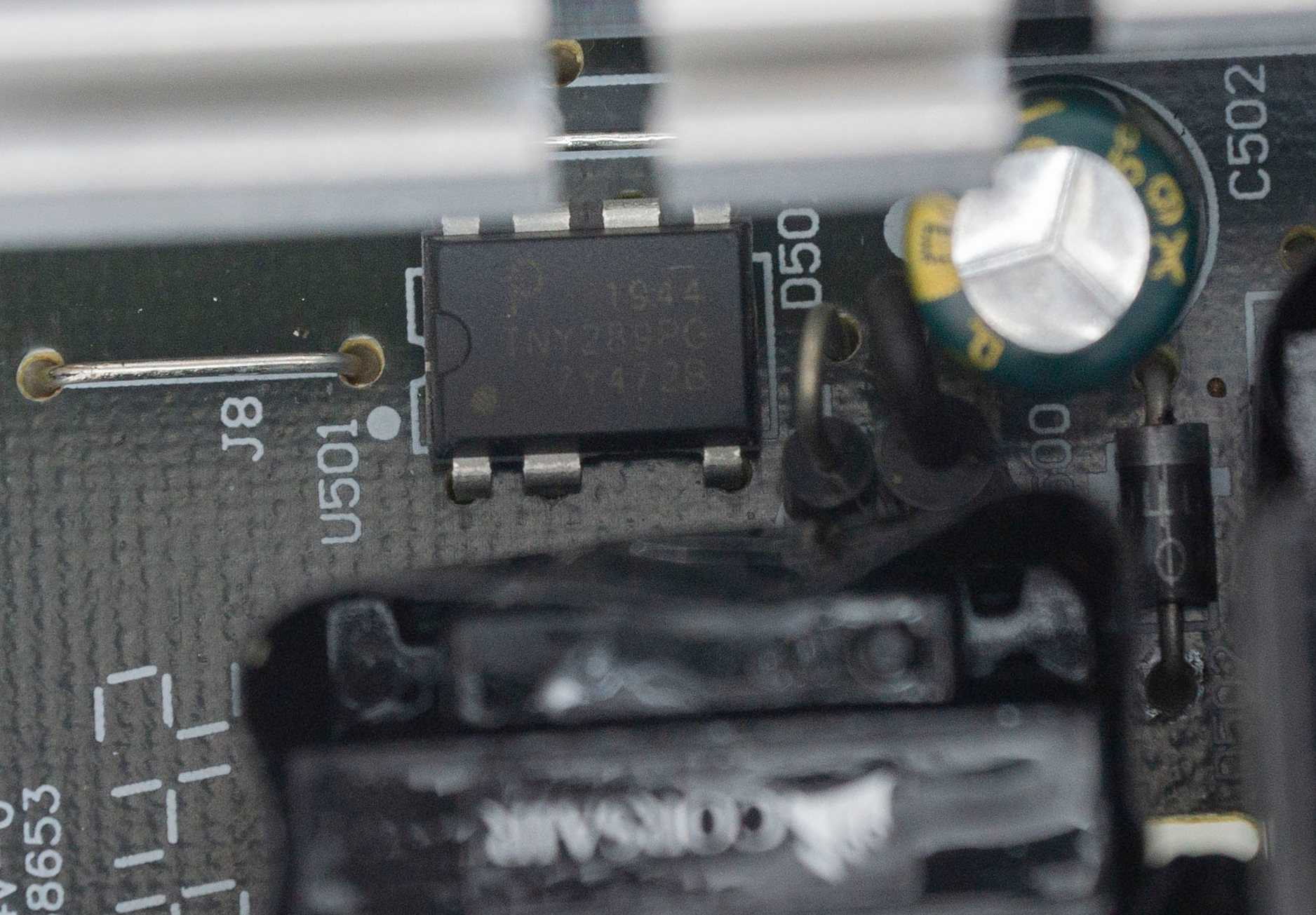 Также на плате присутствует чип CAP200DG с резисторами, разряжающими конденсаторы после отключения питания. Плата закрывается диэлектрической прокладкой.