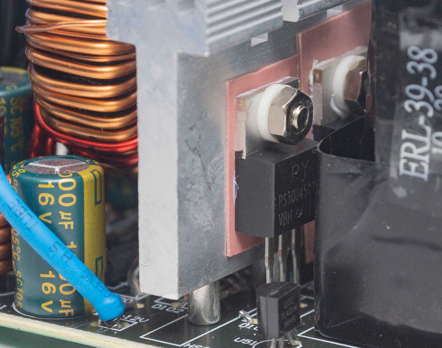 Следующий радиатор охлаждает восемь диодов, прикрученных с двух сторон: четыре PS30U45CTR для линий +3,3 В и +5 В и четыре PFR30L60CTR для линии +12 В.