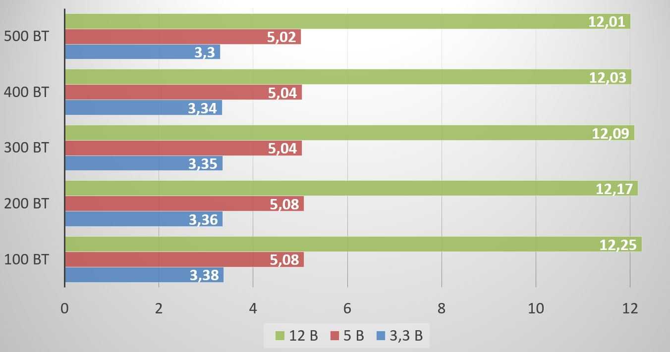 Тестовый стенд позволяет нагружать линию +12 В с шагом в 100 Вт. Линии +3.3 В и +5 В подключались к постоянной нагрузке в 50 Вт.