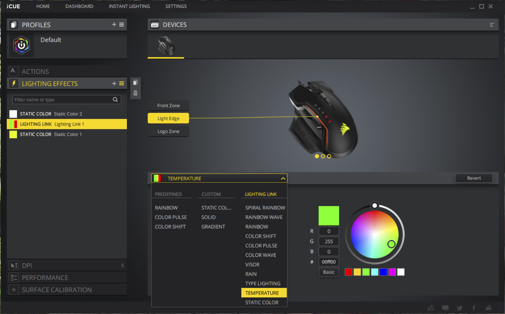 In iCUE, you can choose 5 DPI settings plus a Sniper Mode setting, and select light colors for the DPI settings with an optional extra color to indicate Sniper Mode. Setting up the different lighting zones is a little tricky, as each zone needs its own filter to be controlled separately from the other zones. But, once established, the effects are simple enough to implement. There are options for a rainbow, color pulse, gradient, static colors, and some neat Lighting Link effects — I opted to have the LEDs correspond with temperatures of my CPU on the Corsair logo and GPU on the side strips.