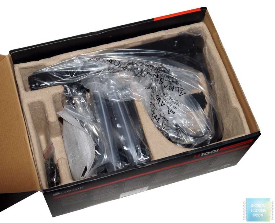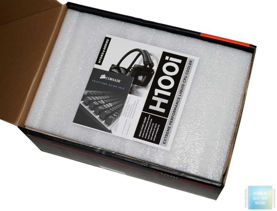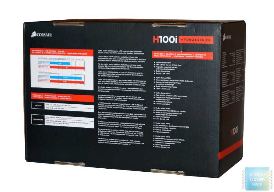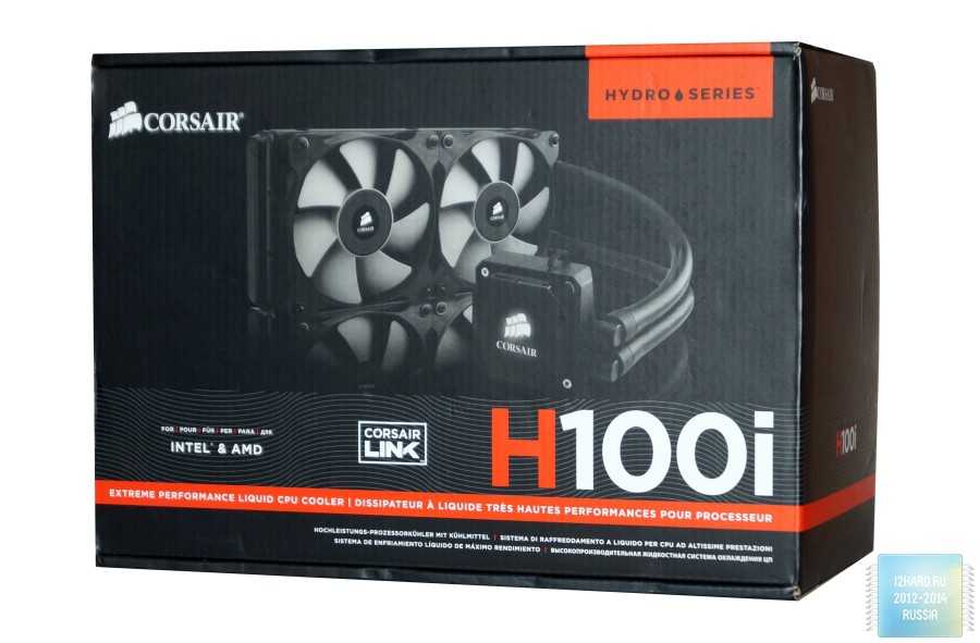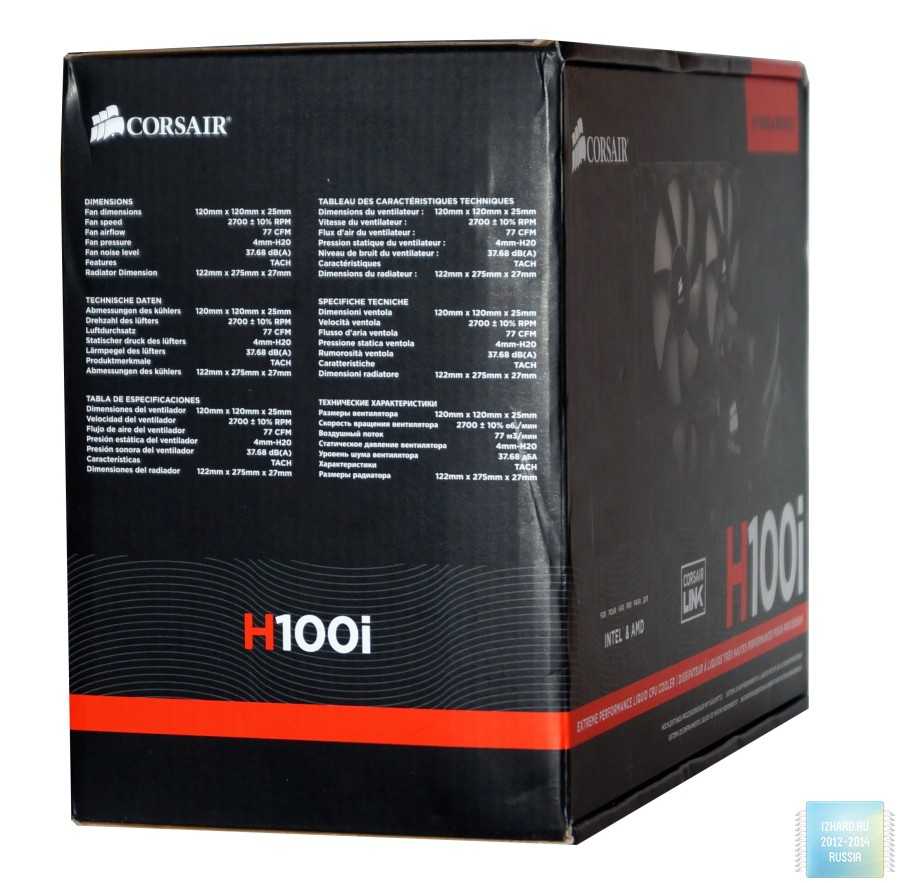 Поставляется Corsair H100i в картонной коробке. На внешней части упаковки имеется большое количество информации опродукте.