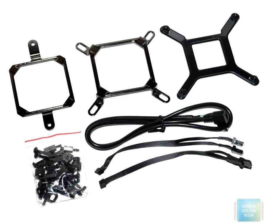 На следующем фото представлен набор для монтажа СЖО, а также провод для соединения Corsair H100i с материнской платой (Corsair Link) идва Y-образных разветвителя для подключения вентиляторов к водоблоку-помпе(что дает возможность мониторинга и контроля скорости их вращения).
