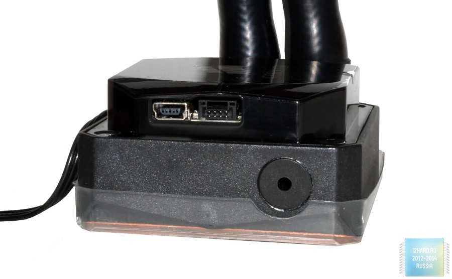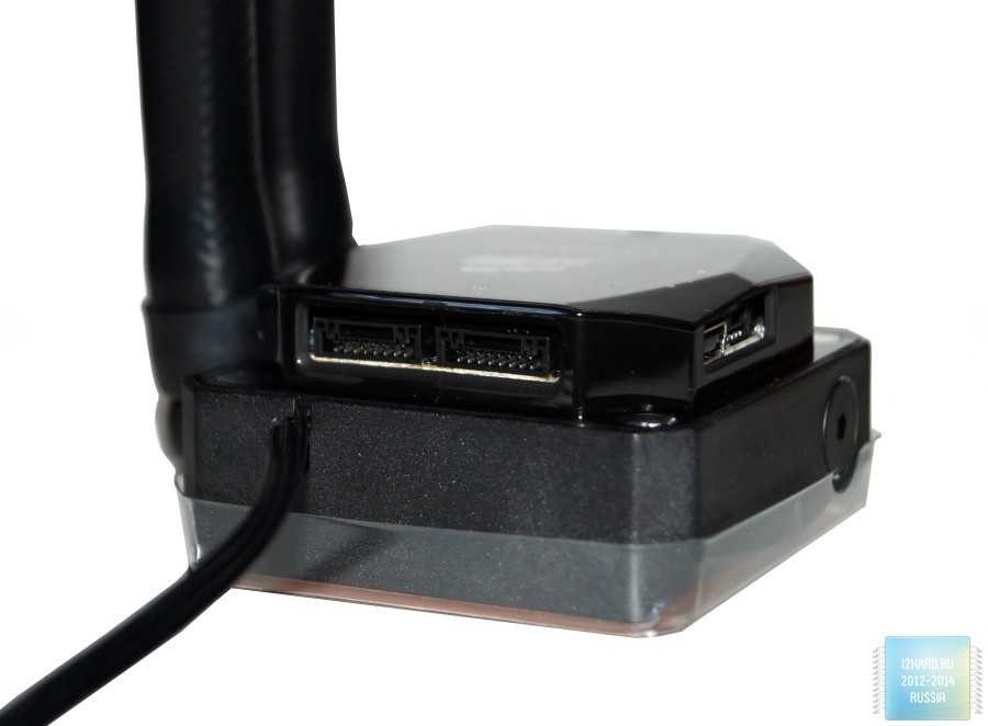 На двух боках водоблокаможно обнаружить множество разъемов. Дваиз них используются для подключения Y-образных разветвителей для вентиляторов, что даст возможность мониторинга и контроля скорости их вращения, а также разъем для подключения комплекса к материнской плате(Corsair Link).