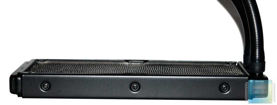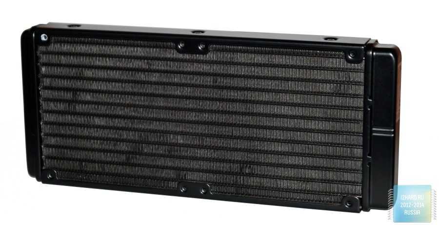 РадиаторCorsair H100iсделан из окрашенного в черный цветалюминия. Длина,как вы уже поняли, немного отличается от часто фигурирующей цифры 240, так, реальнаядлина составляет 275 мм.Жидкость циркулирует по плоским каналам, между которыми расположены вставки из сложенной гармошкой алюминиевой ленты.Рекомендуюбыть аккуратным при монтаже радиатора в корпус -можнолегко сорвать резьбу, если приложить излишнее усилие при затягивании винтов, даи с оребрением нужно быть внимательнее, неаккуратное движение и тонкие пластины мнутся как пластилин. Водоблок соединенс радиатором с помощью толстых жестких шлангов, нехватка гибкости может доставить некоторые неудобства при установке.