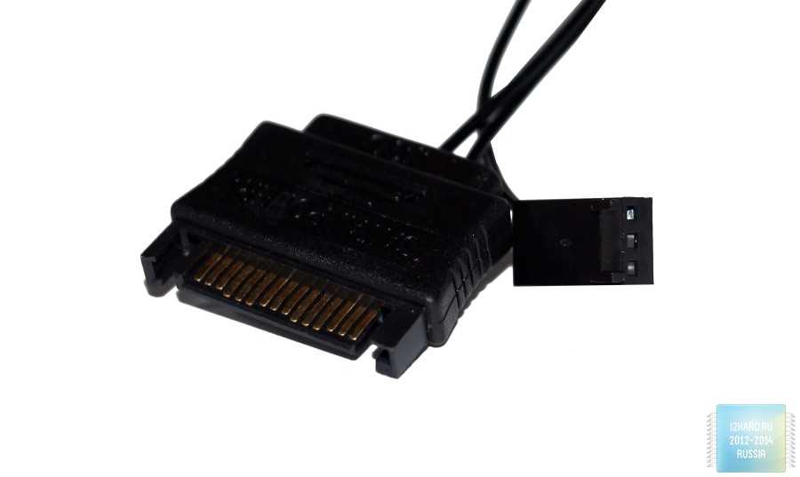 Питание к комплексу водоблок-помпа подключается с помощью двух элементов — 3-pin коннектора (цепляется к материнской плате к CPU_Fan разъему) и SATA. Как видим, производитель решил отказаться от многим привычныхMolex’ов.