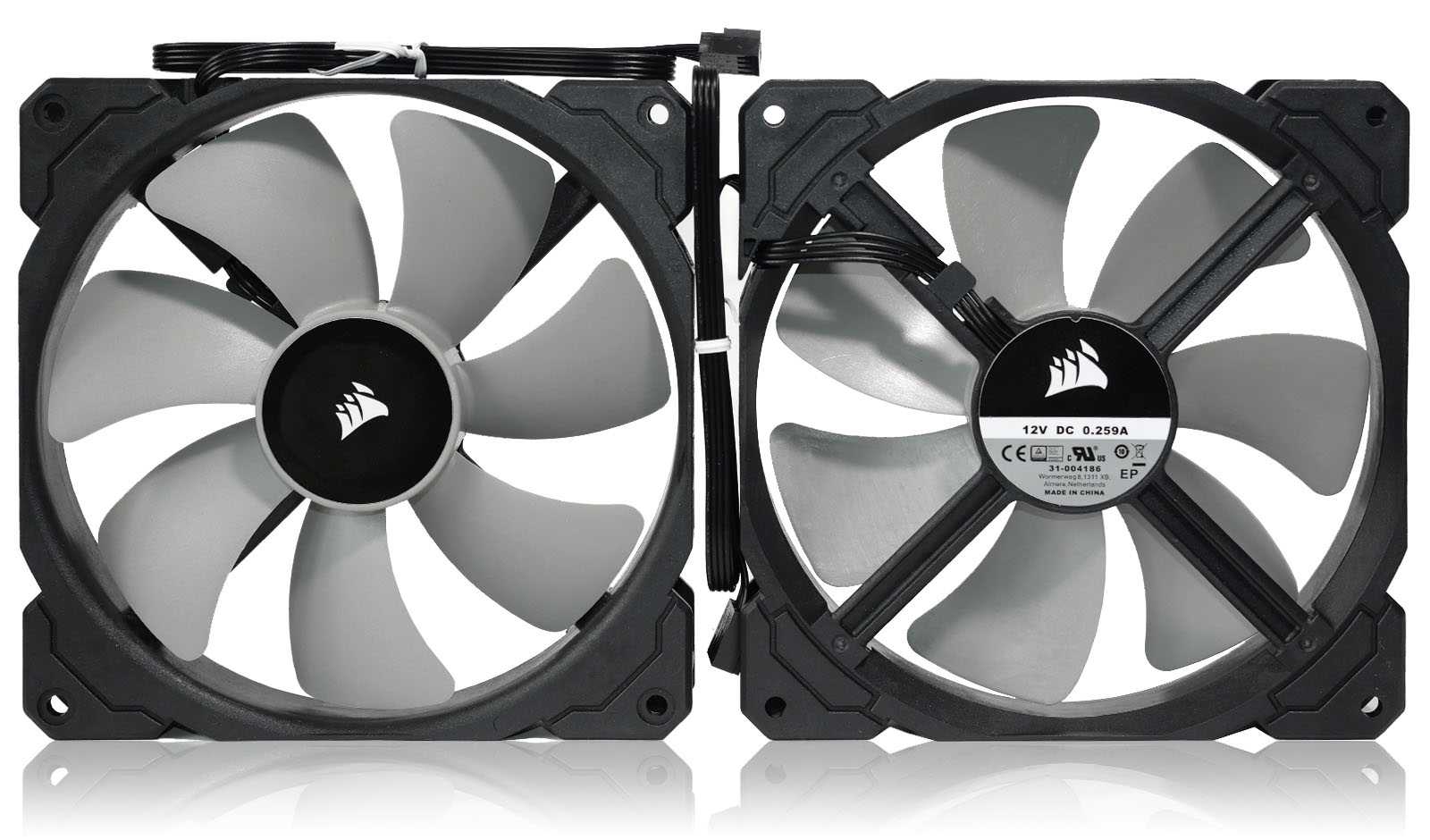 Комплектные семилопастные вентиляторы имеют маркировку Corsair 31-004186. По описанию на официальном сайте они относятся к серии CORSAIR ML140 PRO с технологией магнитной левитации и специально разработанного ротора, что обеспечивает высокую эффективность при сниженном (по сравнению с классическими подшипниками) уровне шума