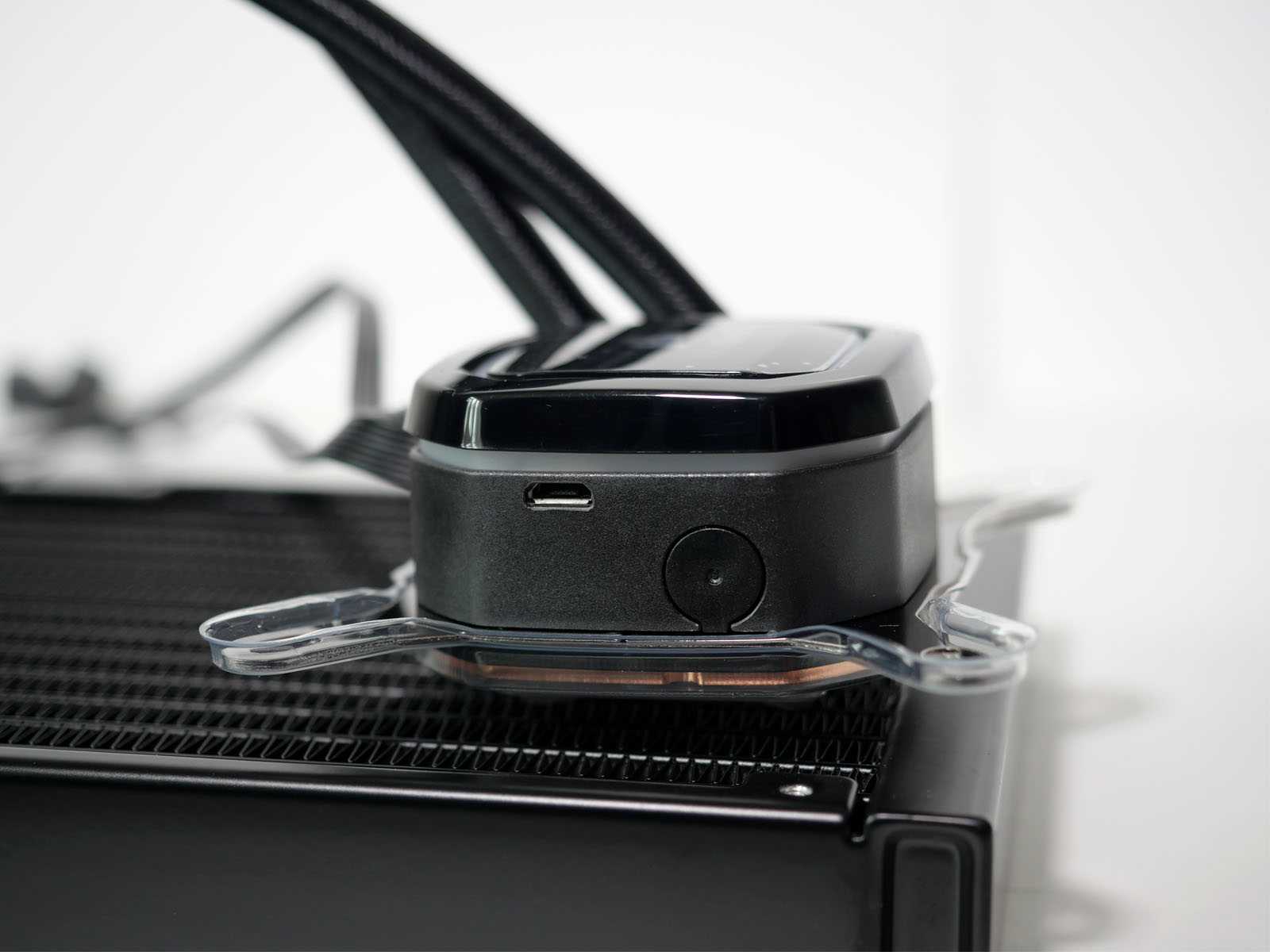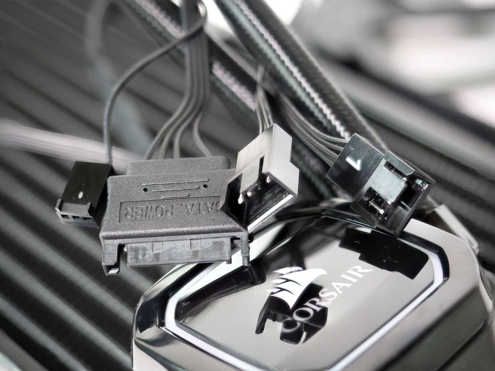 От помпы идёт пара кабелей, включая двойной на питальник SATA3 и 3-пин в материнку, а также двойной под вентиляторы, 4-контактный с поддержкой ШИМ.