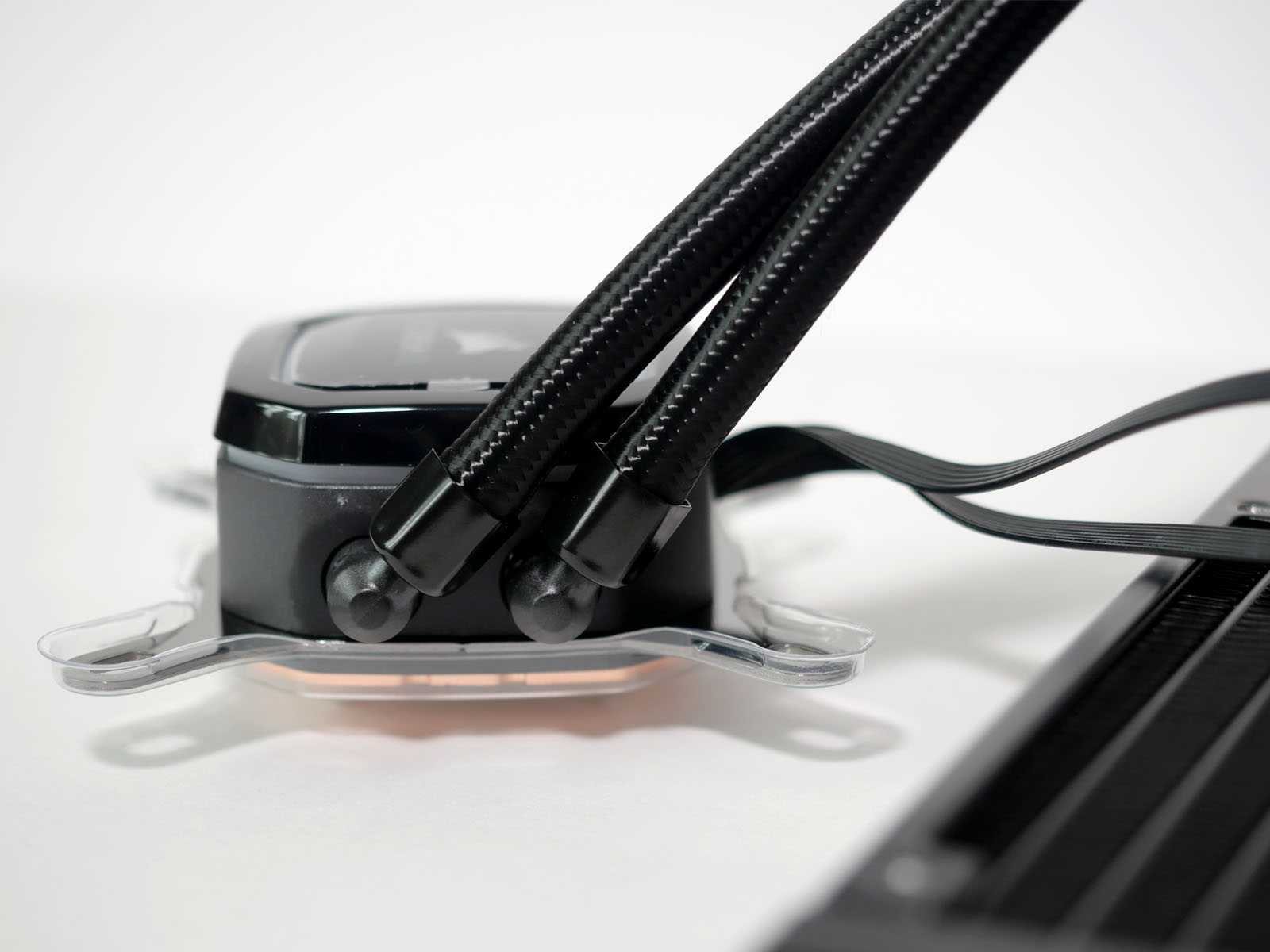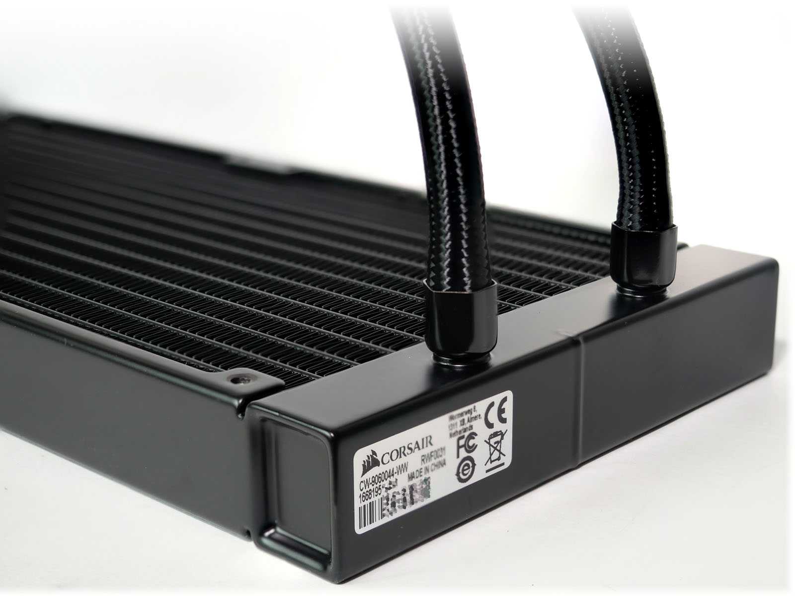 Шланги длиной 38 см имеют дополнительную защиту нейлоновой оплёткой, снижающей риск случайного повреждения. Точки подключения к радиатору и помпе качественно опрессованы. На помпе используются изогнутые на 90 градусов поворотные фитинги, а на радиаторе — прямые.
