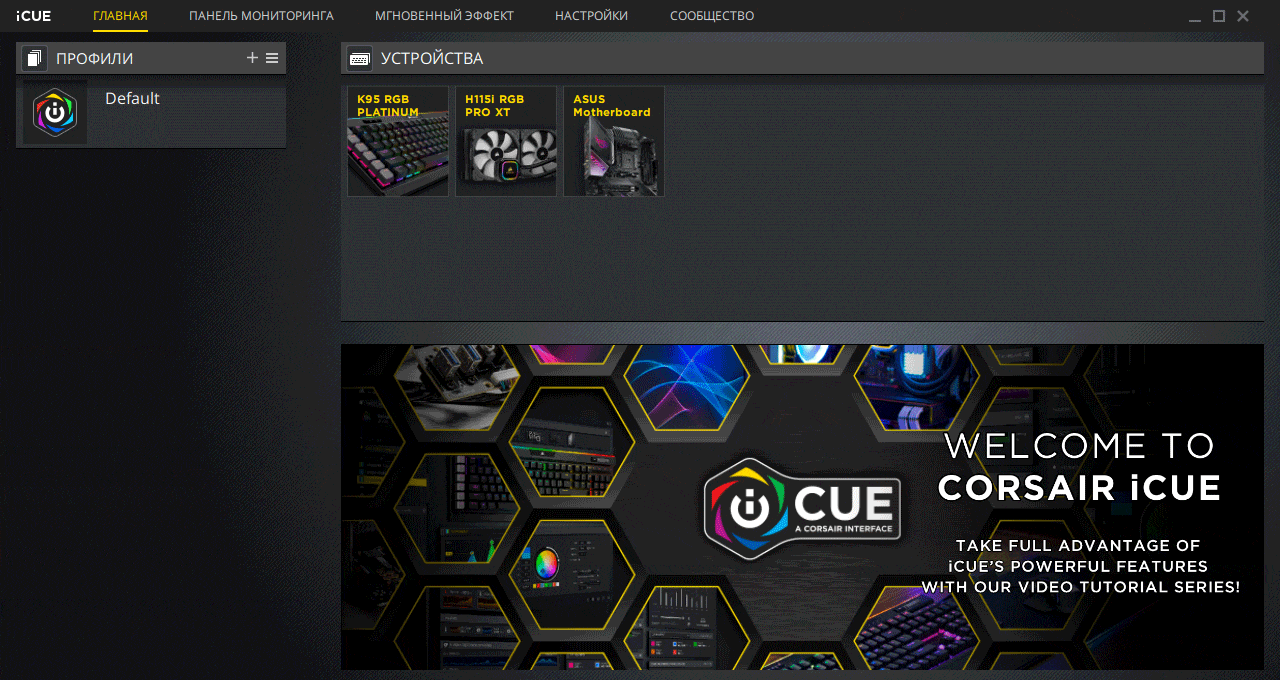 Для управления всеми устройствами Corsair применяется бесплатная утилита iCUE, доступная для загрузки на сайте производителя. Дистрибутив и интерфейс программы русифицирован. На момент тестирования актуальная версия — 3.26.95.