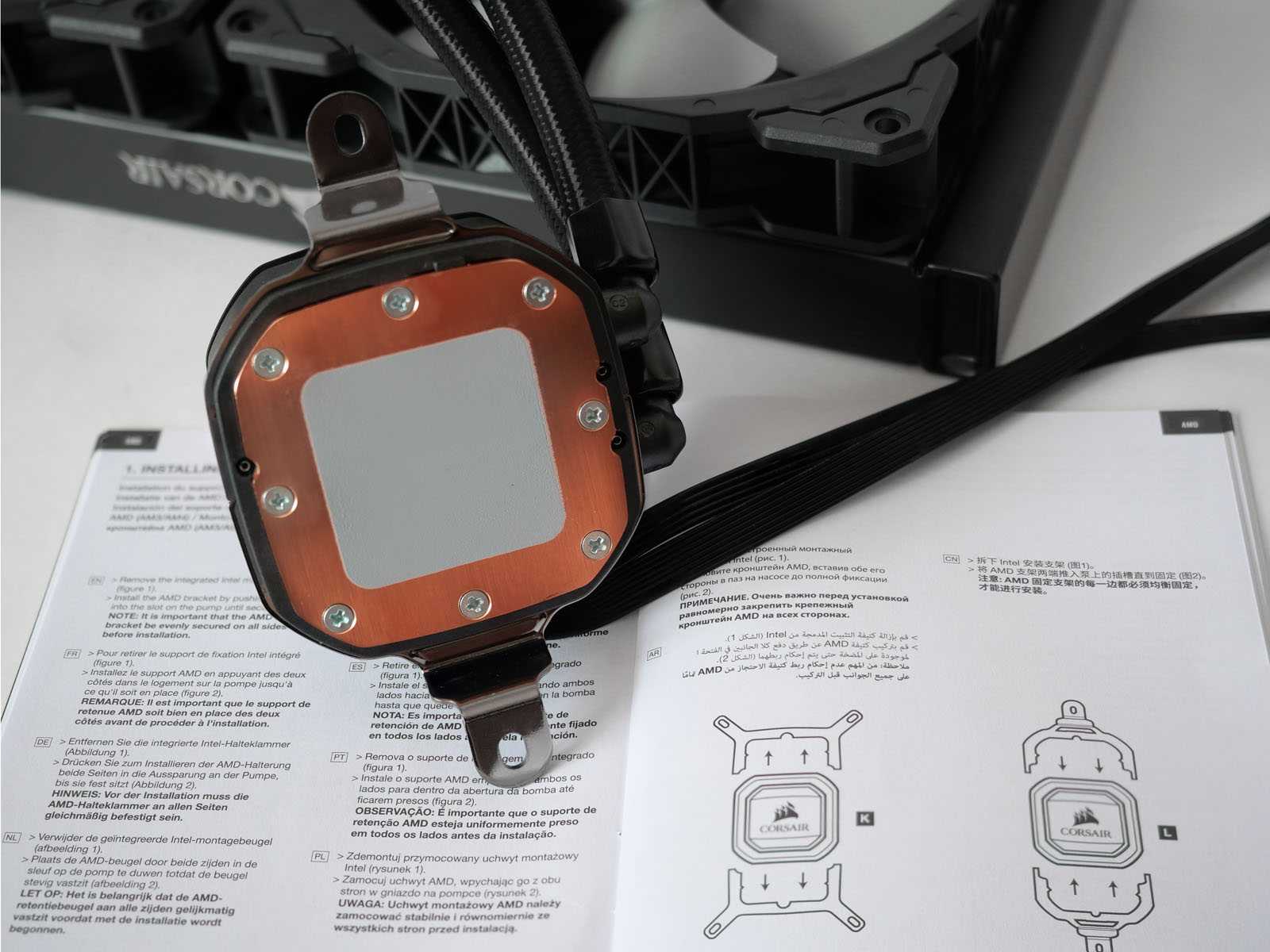 Общая высота радиатора с установленными вентиляторами составляет 52 мм. На длинных боковых гранях посередине приклеены хромированные логотипы Corsair, перевернутые таким образом, чтобы в корпусе они были хорошо заметны и читаемы.