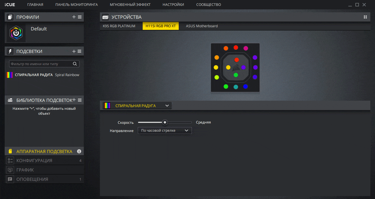 Управление феерией цвета реализовано в разделе «Подсветки» в программе iCUE. Для выбора доступно большое количество различных анимированных эффектов, синхронизируемых с устройствами не только из экосистемы Corsair, но и других производителей.