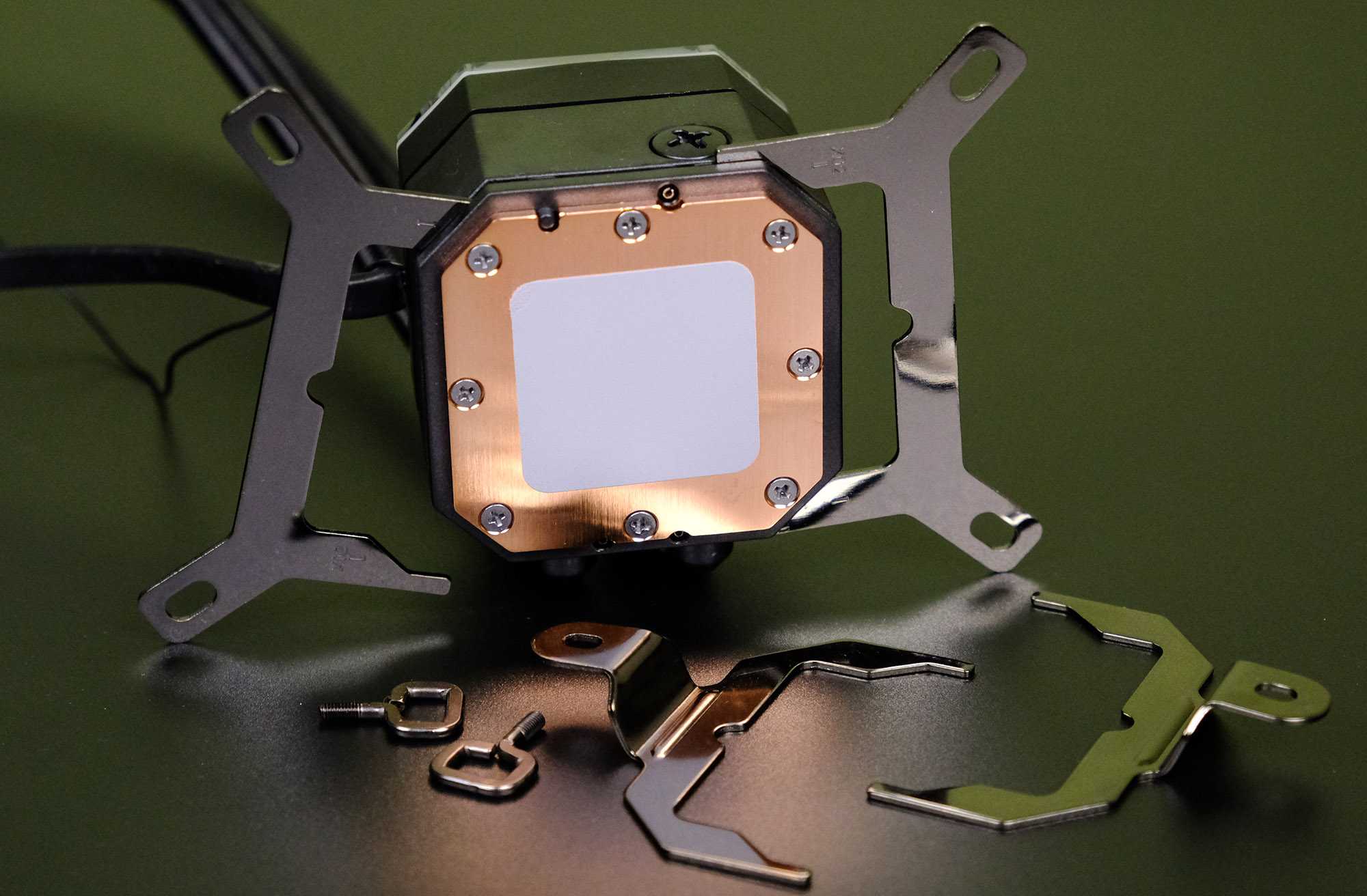 Конкретно в случае с AM4 потребуется стандартный родной бэкплейт и крепёж – без него установить СВО не получится. Сам процесс происходит буквально в три шага: надеваем нужные скобки на водоблок, после чего цепляем направляющие за родной крепёж AM4 и накручиваем сверху прижимные головки.