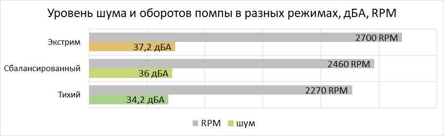 Результаты показывают, что на минимальных оборотах (2270 RPM) помпа почти не слышна, на сбалансированном режиме её уже можно услышать в открытом корпусе, а на максимальных 2700 RPM она может выделяться уже на фоне системы в простое (что, конечно, сложно представить в реальных условиях).