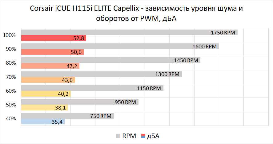 Здесь результаты, предсказуемые для крупных вентиляторов без виброизоляции в местах соприкосновения с радиатором. Тем не менее, на максимальных оборотах они показали порядка 52 дБА, что не так уж плохо. К тому же в таком режиме работать они вряд ли будут. А в промежутке 750-1300 RPM (40-70% ШИМ) они достаточно тихие – не больше 43,6 дБА.