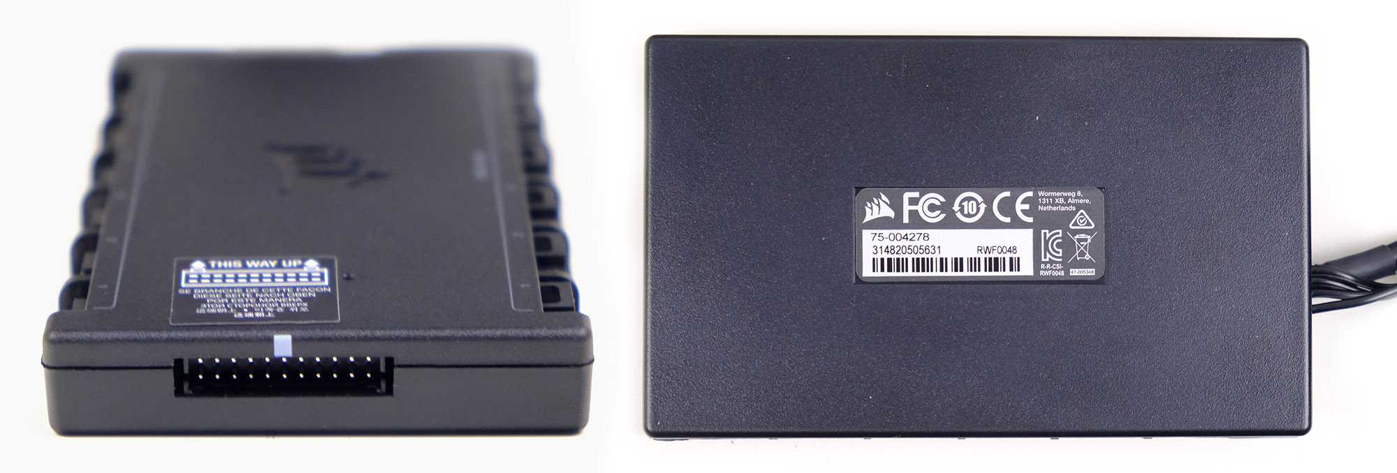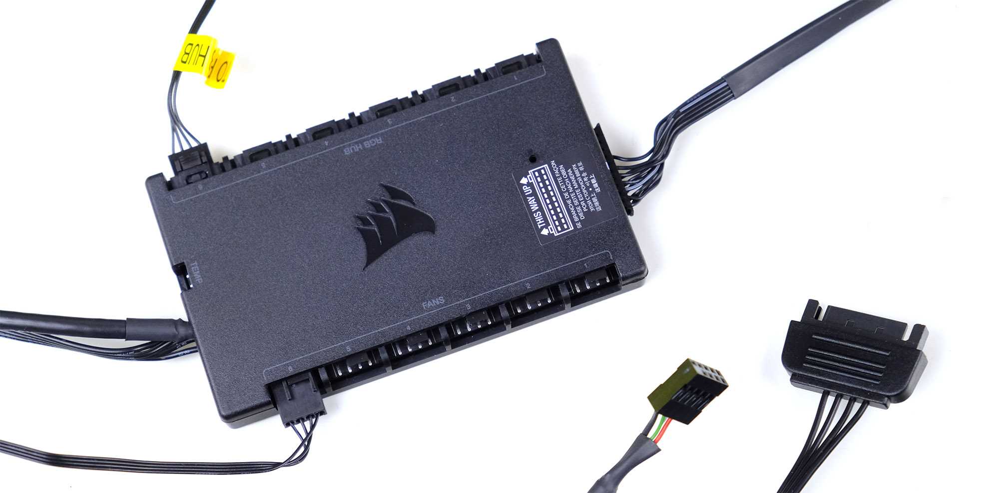 Для управления подсветкой в комплекте к СВО приложен контроллер iCUE Commander CORE с 6 разъёмами для подключения RGB-устройств и хабом для питания 6 вентиляторов 4pin.