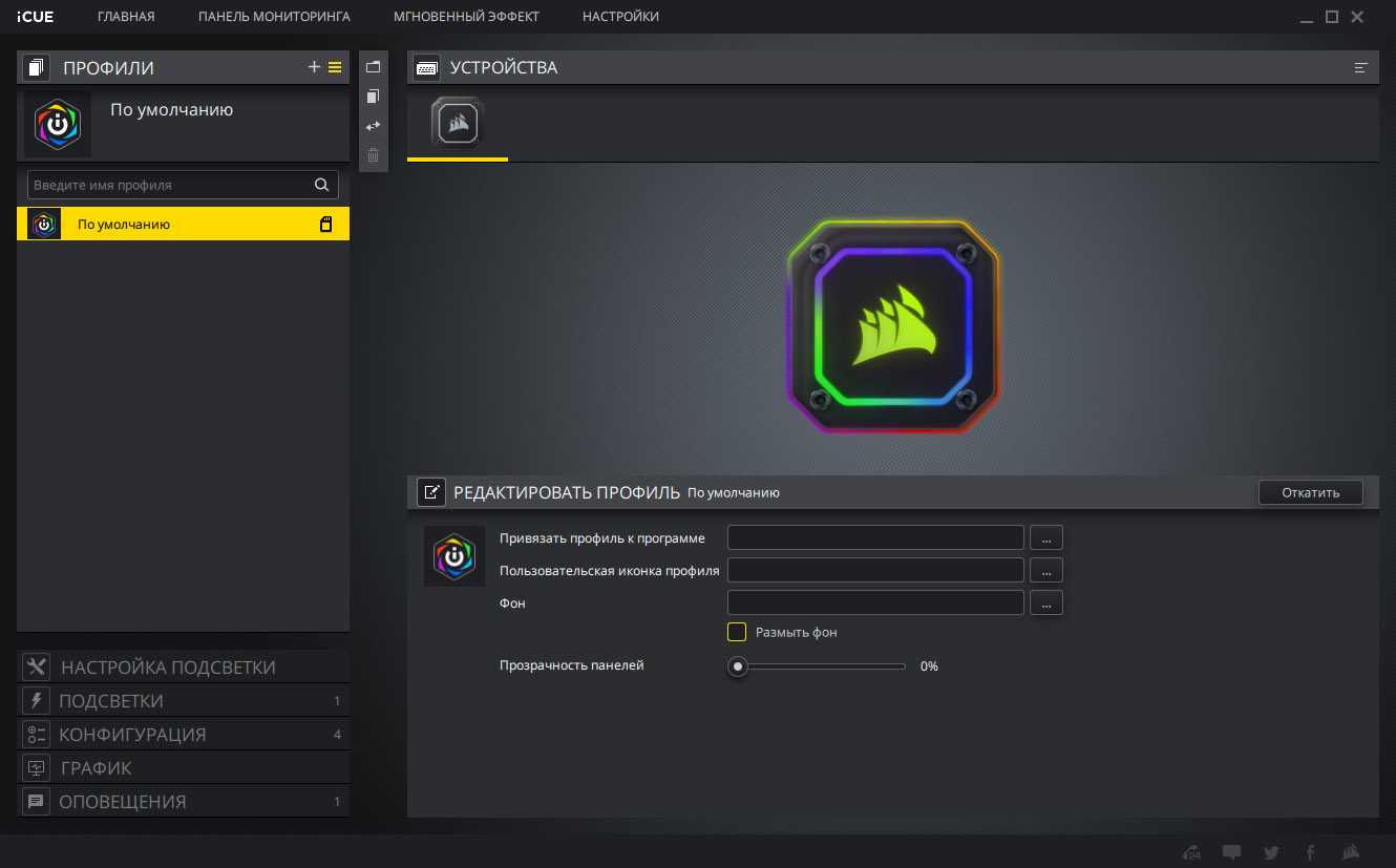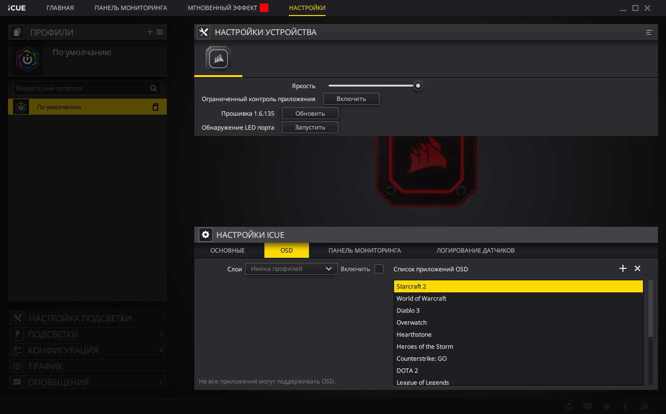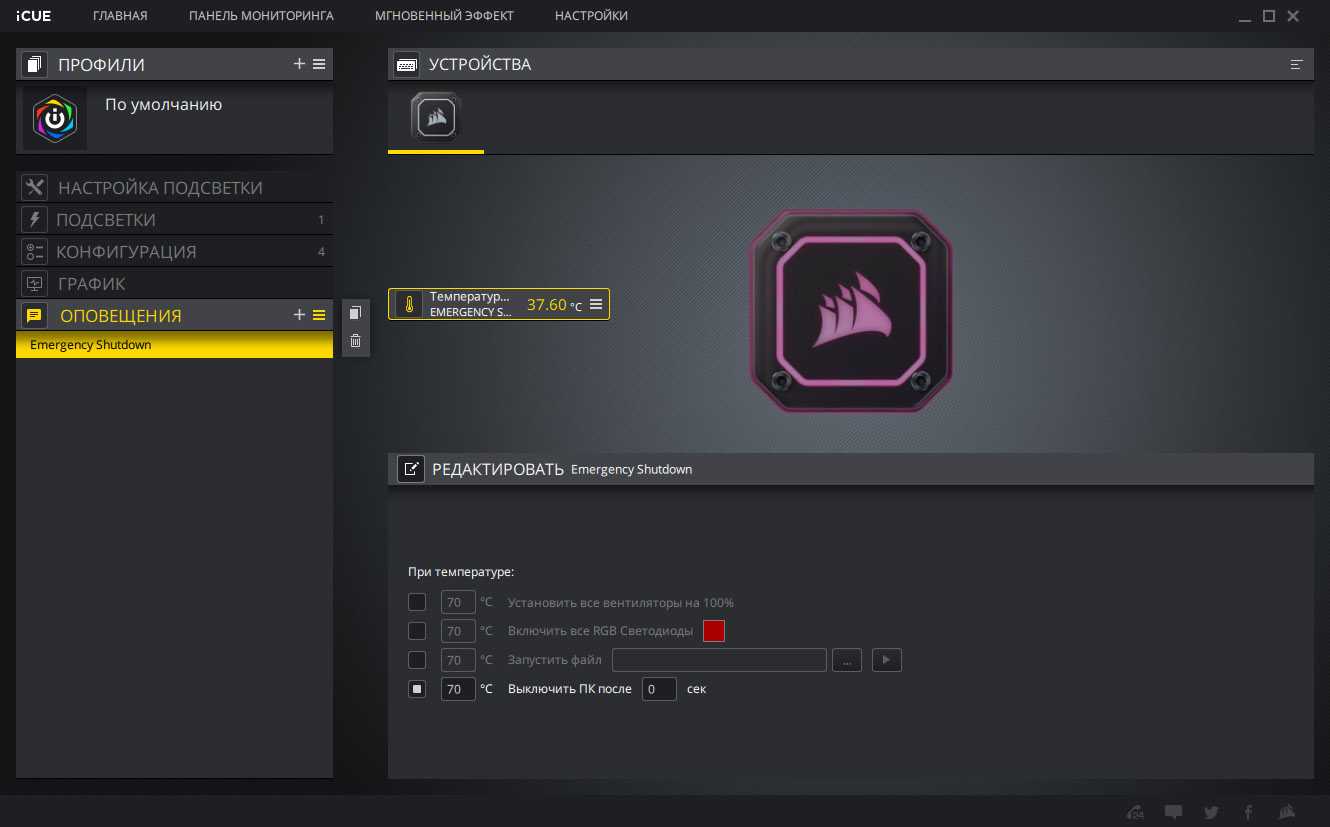 Вернёмся к приложению iCUE. Кроме опций подсветки в нём присутствует служба оповещений о критических событиях в системе, которые можно задать самостоятельно. Есть и стандартная система профилей устройства для различных приложений.