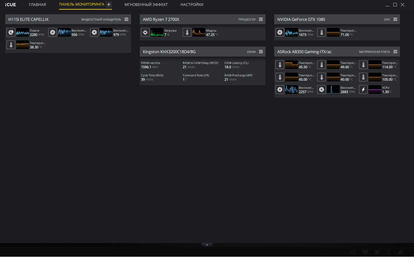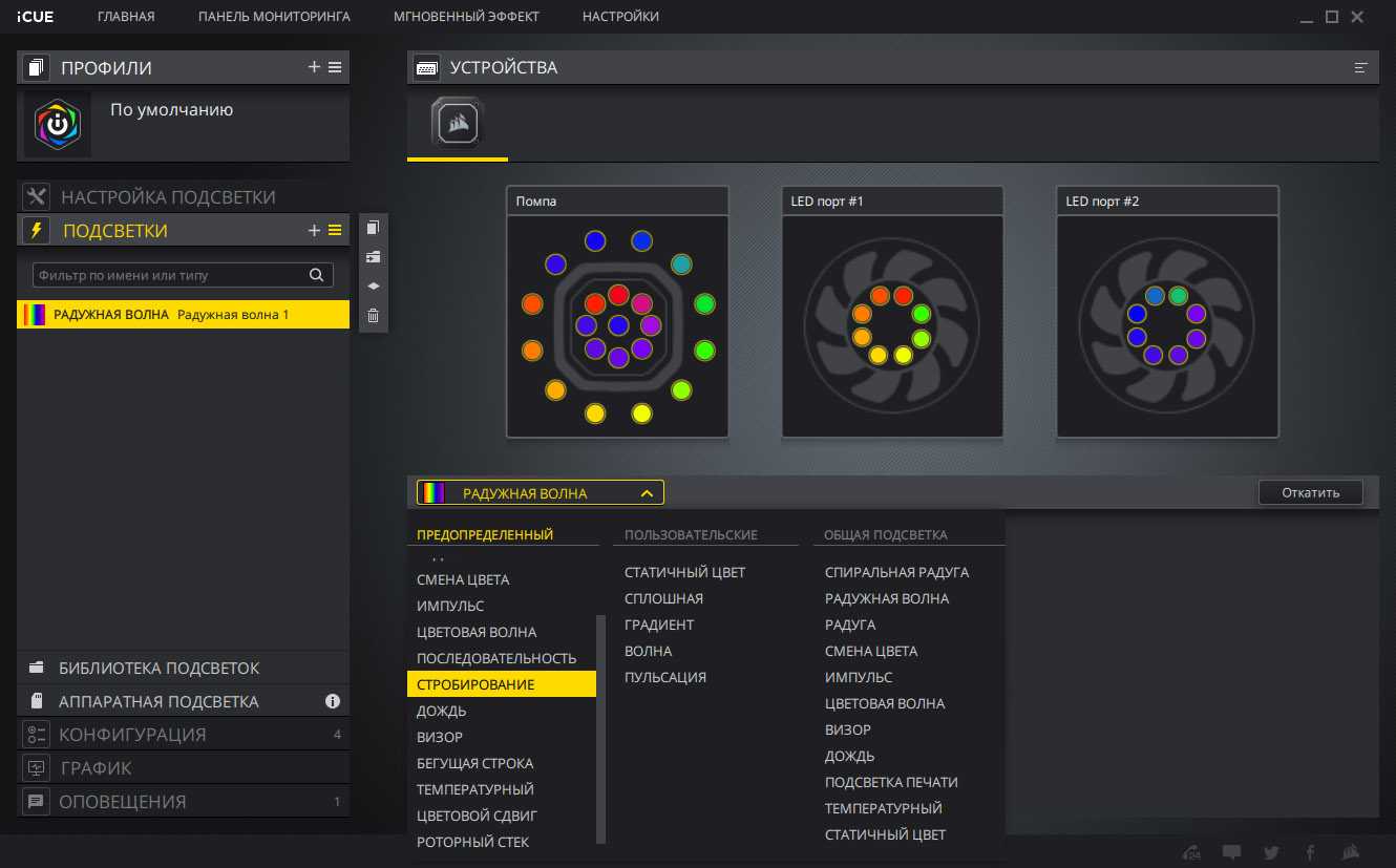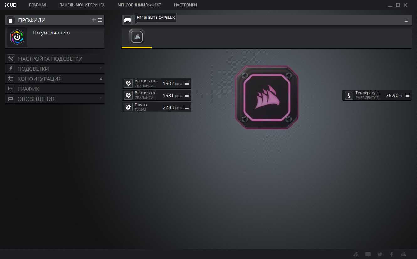 Для управления CORSAIR iCUE H115i ELITE Capellix понадобится скачать с официального сайта приложение iCUE последней версии, после чего откроется доступ к настройкам эффективности, а также кастомизация подсветки.