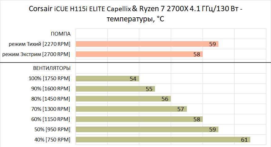 При 100% оборотов вентиляторов (1750 RPM) процессор удалось разогреть всего до 54 °C – это отличный результат, показывающий высокий потенциал СВО CORSAIR iCUE H115i ELITE Capellix. Даже при минимальных оборотах (750 RPM) Ryzen 7 2700Х не нагрелся выше 61°C, хотя 130 Вт тепловыделения — это не так уж и мало. Таким образом, напрашивается вывод, что для всех популярных десктопных процессоров данной СВО хватит с большим запасом, даже если вы планируете разгон чипа. Хорошо себя вести модель будет и c процессорами Threadripper sTR4 со 180+ Вт TDP, а вот насчёт sTRX4 с 280 Вт мощности вряд ли хватит для комфортной работы – лучше посмотреть на ещё более мощные трёхсекционные СВО.
