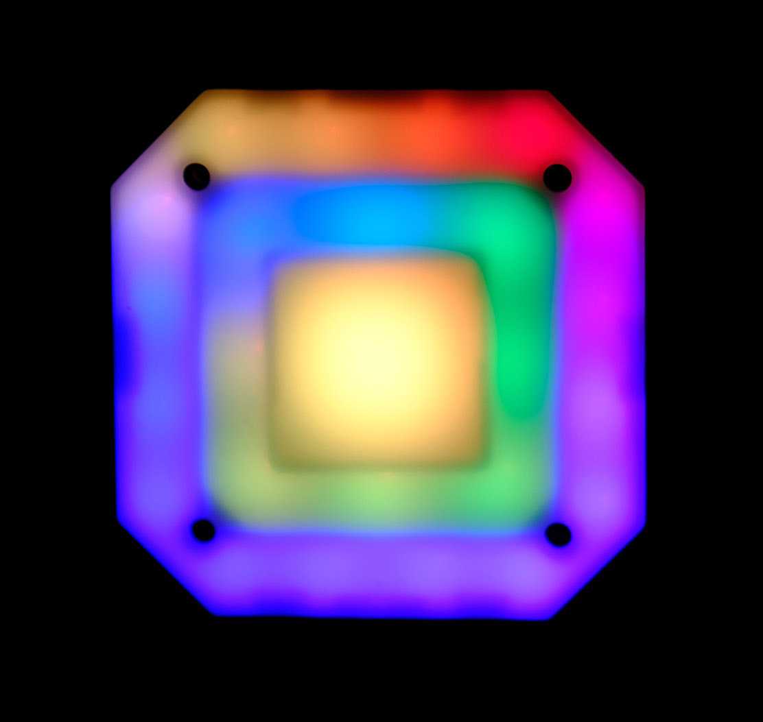 При снятой панели с крышки водоблока хорошо видно, что подсветка получилась очень детальной, светодиоды расположены плотно, так что можно организовать чёткие последовательности. По-разному эффекты смотрятся на чёрной и белой панели.