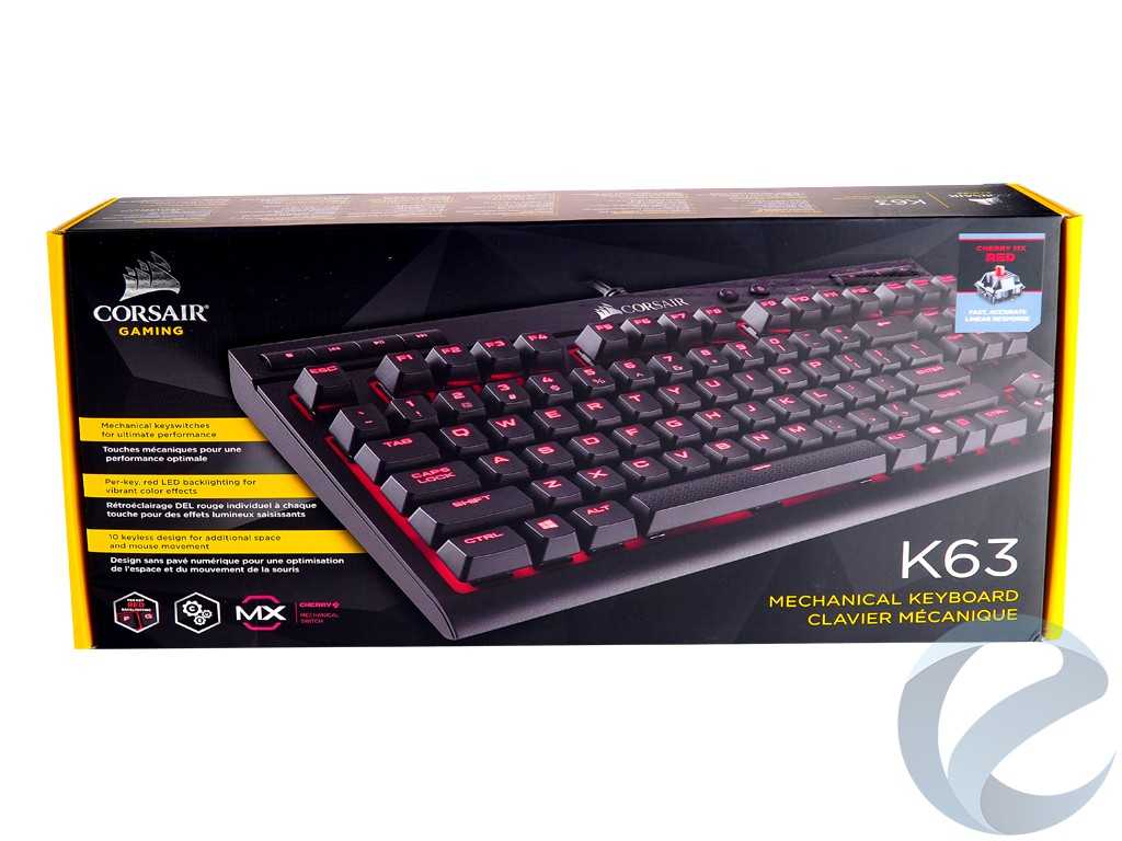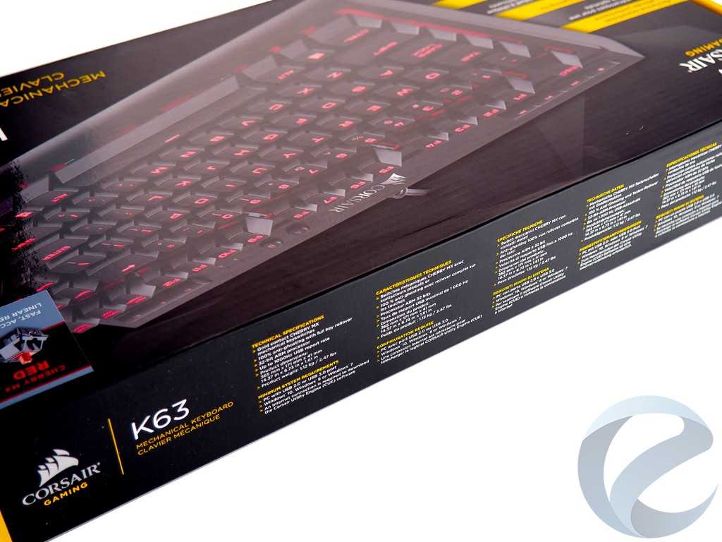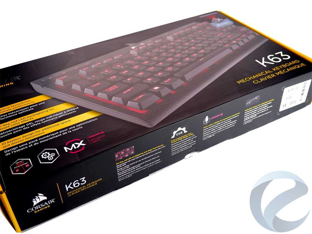 Упаковка выполнена из картона полиграфического типа, окрашенного в желто-черные фирменные цвета компании Corsair. На лицевой части коробки крупно изображена клавиатура K63 с красной подсветкой. В правом верхнем углу бокса приклеен стикер с указанием модели механических переключателей, использующихся для данной модели. Ниже крупно напечатано короткое название клавиатуры. Левая часть бокса изобилует перечислением особенностеймодели на английском языке.