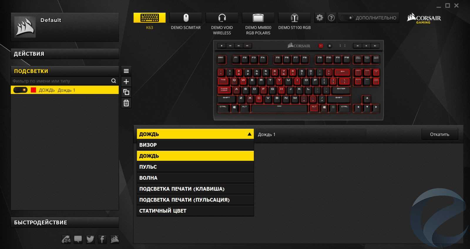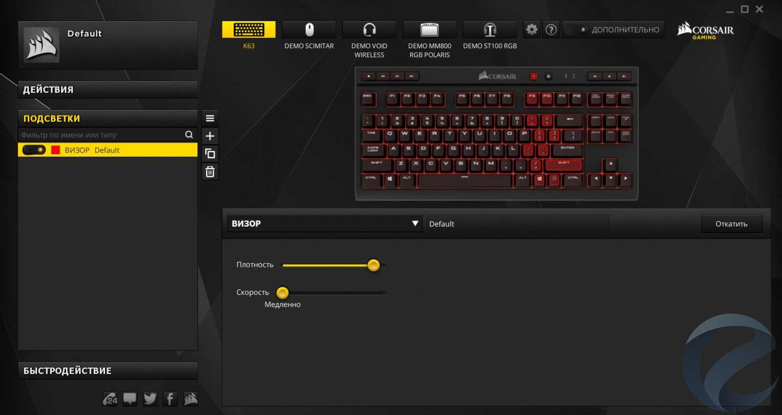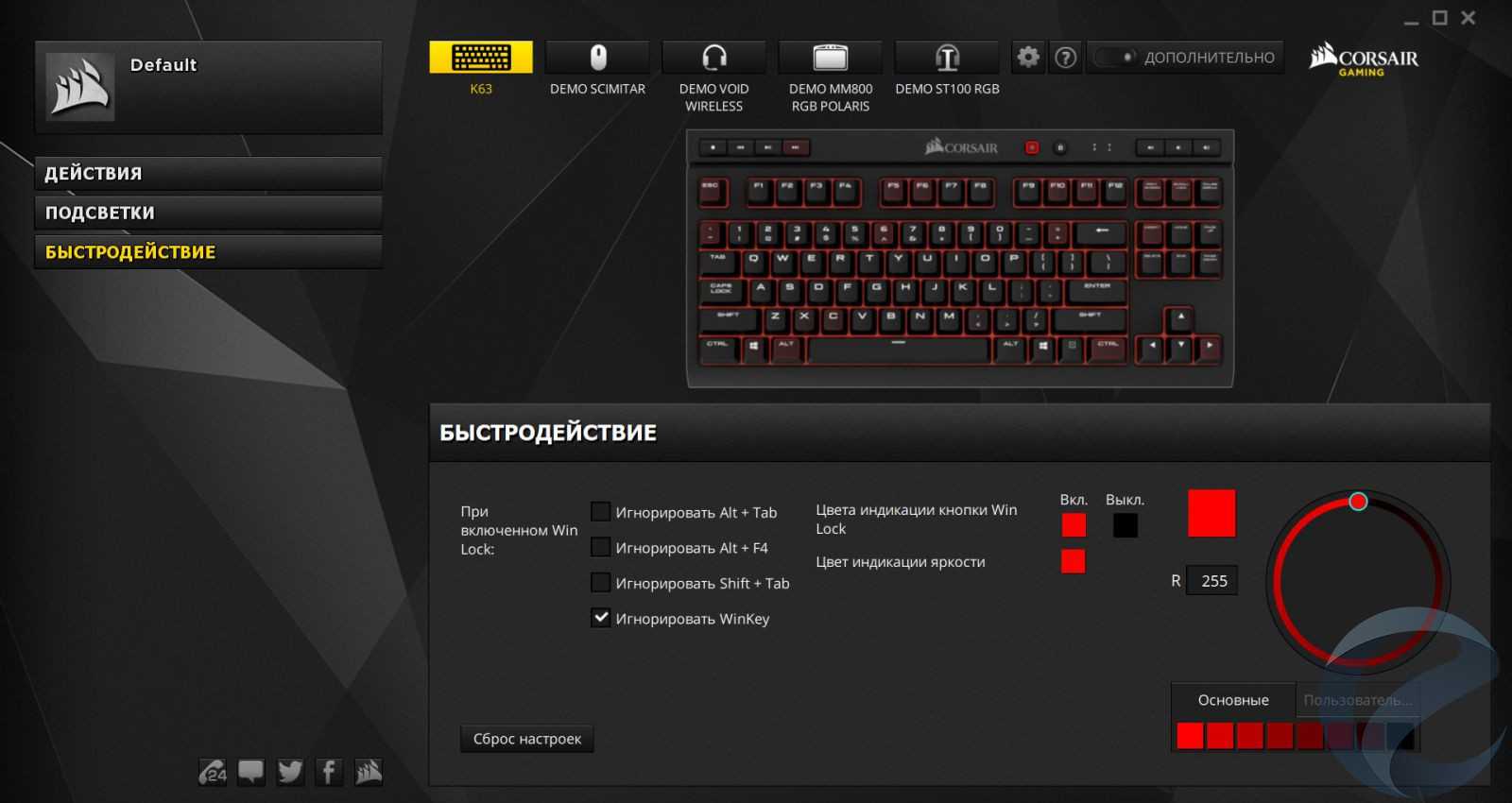 Вторая секция отвечает за красоту и интенсивность подсветки. Семь спецэффектов подсветки, каждый из которых можно настроить по насыщенности цвета и скорости исполнения. Как мы уже упоминали, присутствует только красный цвет, но даже в стольнебольшом спектре можно получить очень приятные глазу переливы.