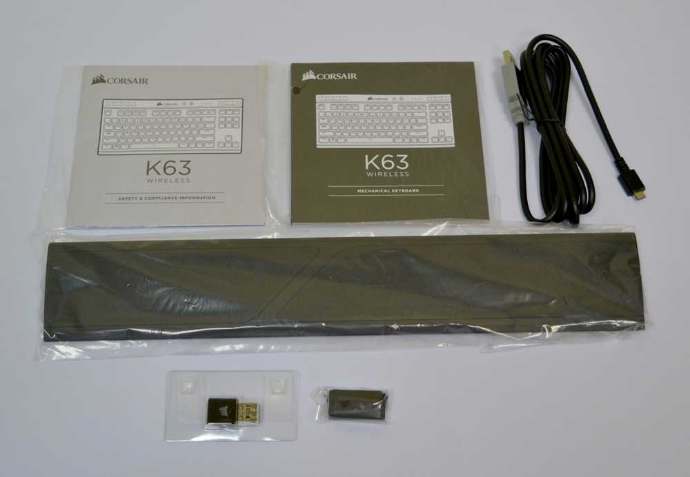 Вместе с клавиатурой Corsair K63 Wireless производитель положил в коробку следующие аксессуары: