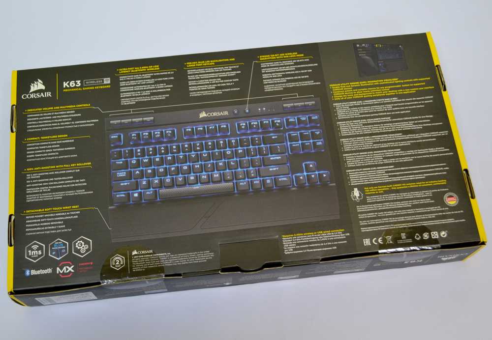 Спереди нас встречает красивое изображение самой клавиатуры, ее название и указания нескольких важных аспектов. А вот уже более подробные технические характеристики и все описания располагаются на противоположной стороне упаковки. Среди главных особенностей клавиатуры Corsair K63 Wireless мы можем отметить: