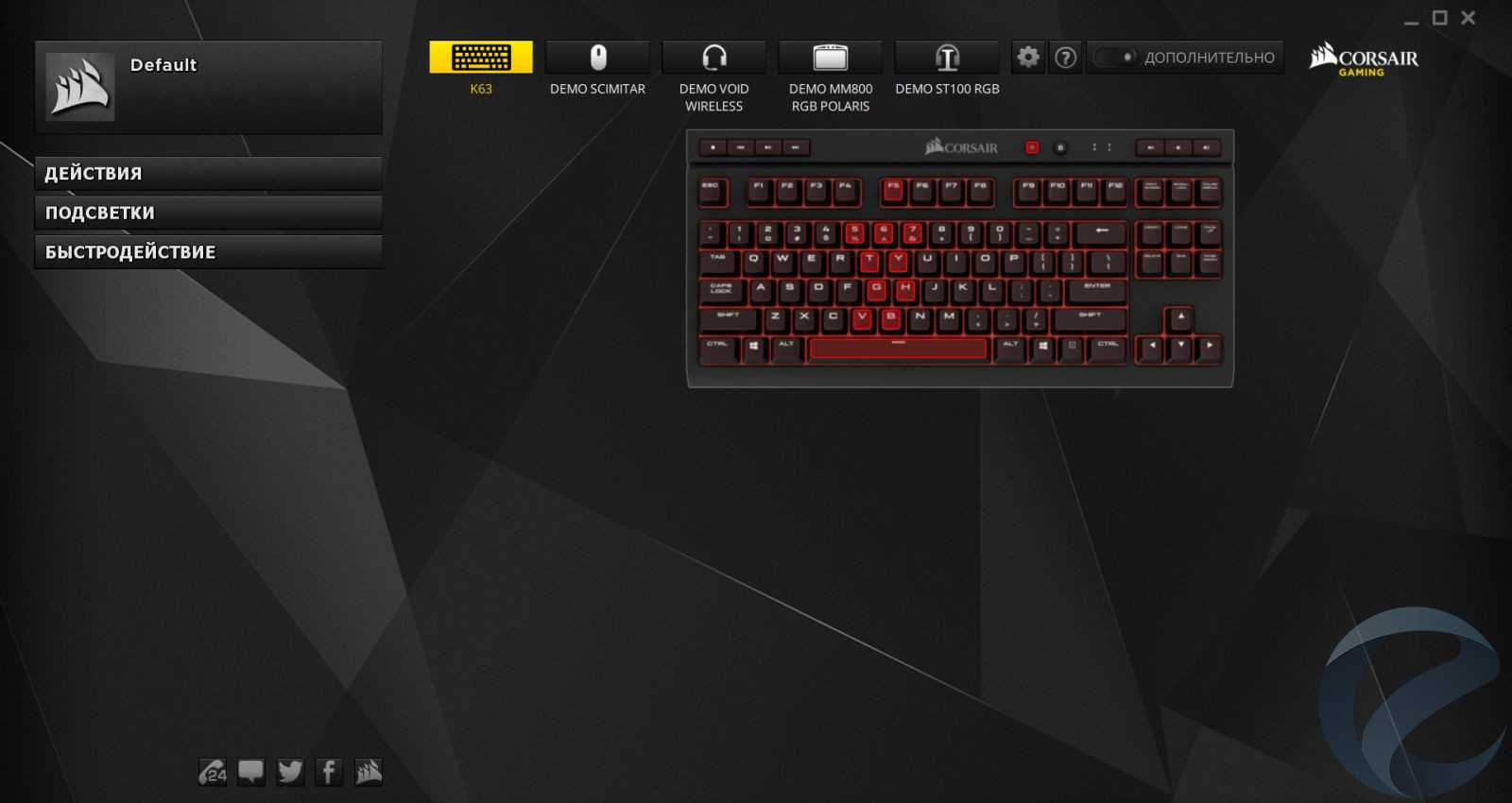 По большому счетувы можете обойтись без установки ПО, но тогдапотеряете ряд полезных и удобных преимуществ. Официальное программное обеспечение можно скачать с сайта компании Corsair. Программная оболочка Corsair Utility Engine (CUE) полностью переведена на русский язык и довольно проста в настройках.