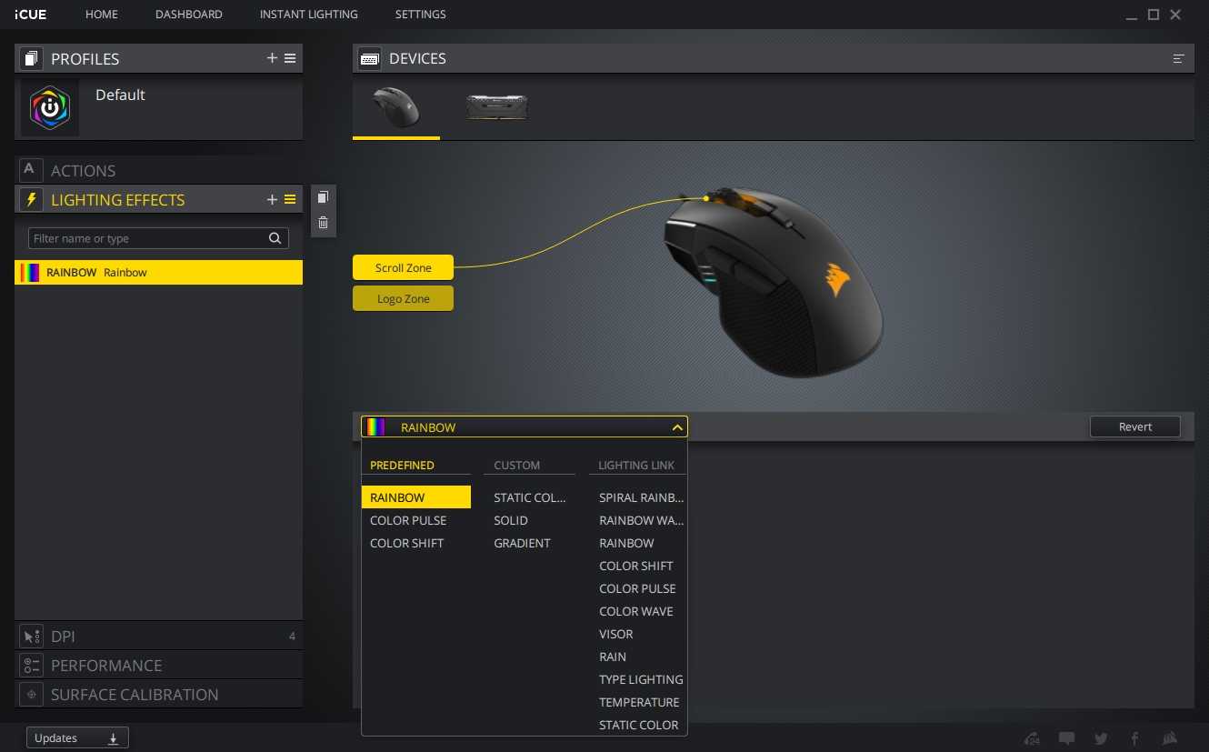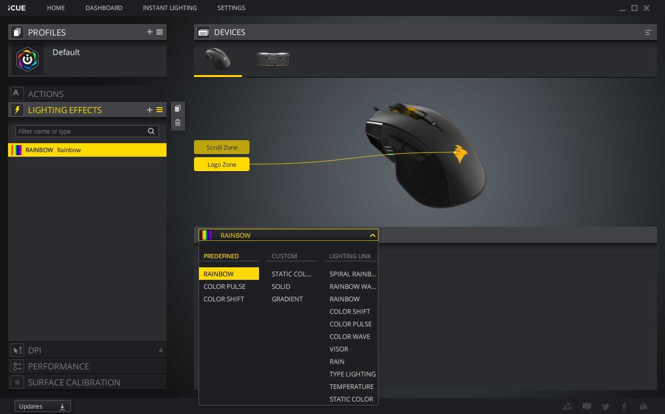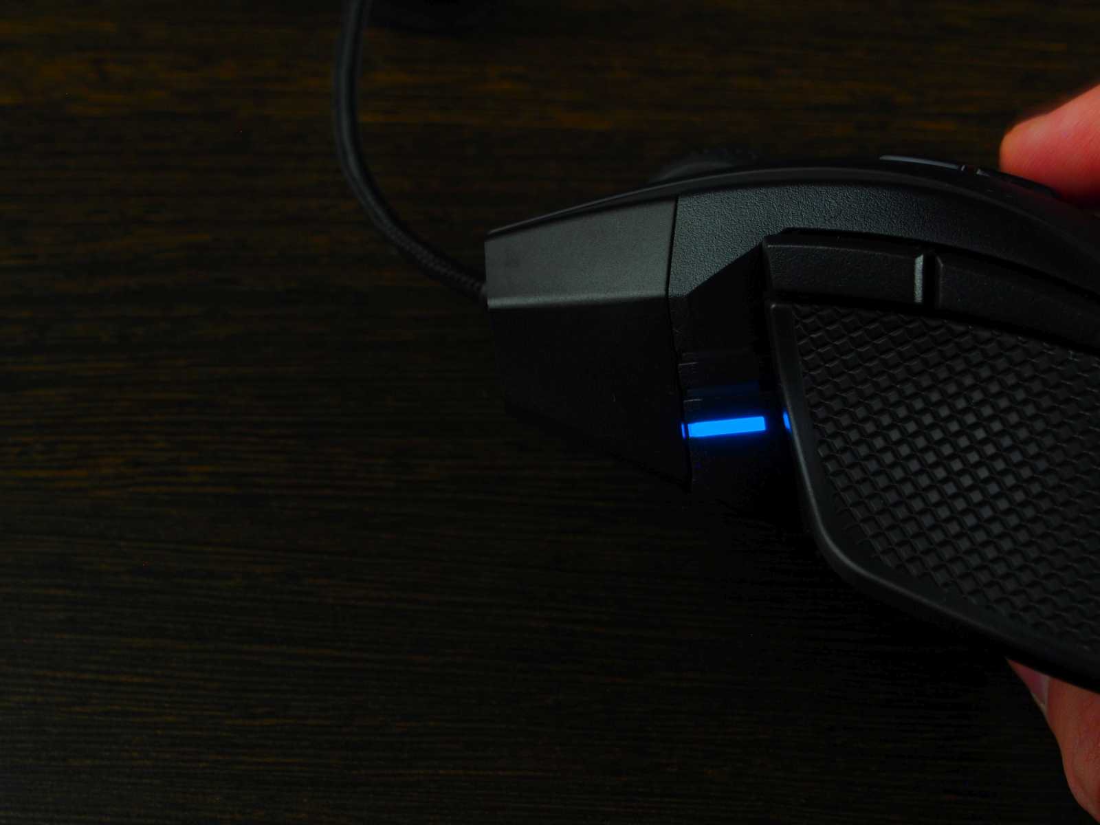 Игровая мышь Corsair Ironclaw RGB не просится в лидеры среди девайсов со светодиодной подсветкой, но подчеркнуть в темное время себя качественно вполне может. Это касается индикаторов активного профиля, а также зон подсветки RGB в области колесика и логотипа Corsair.