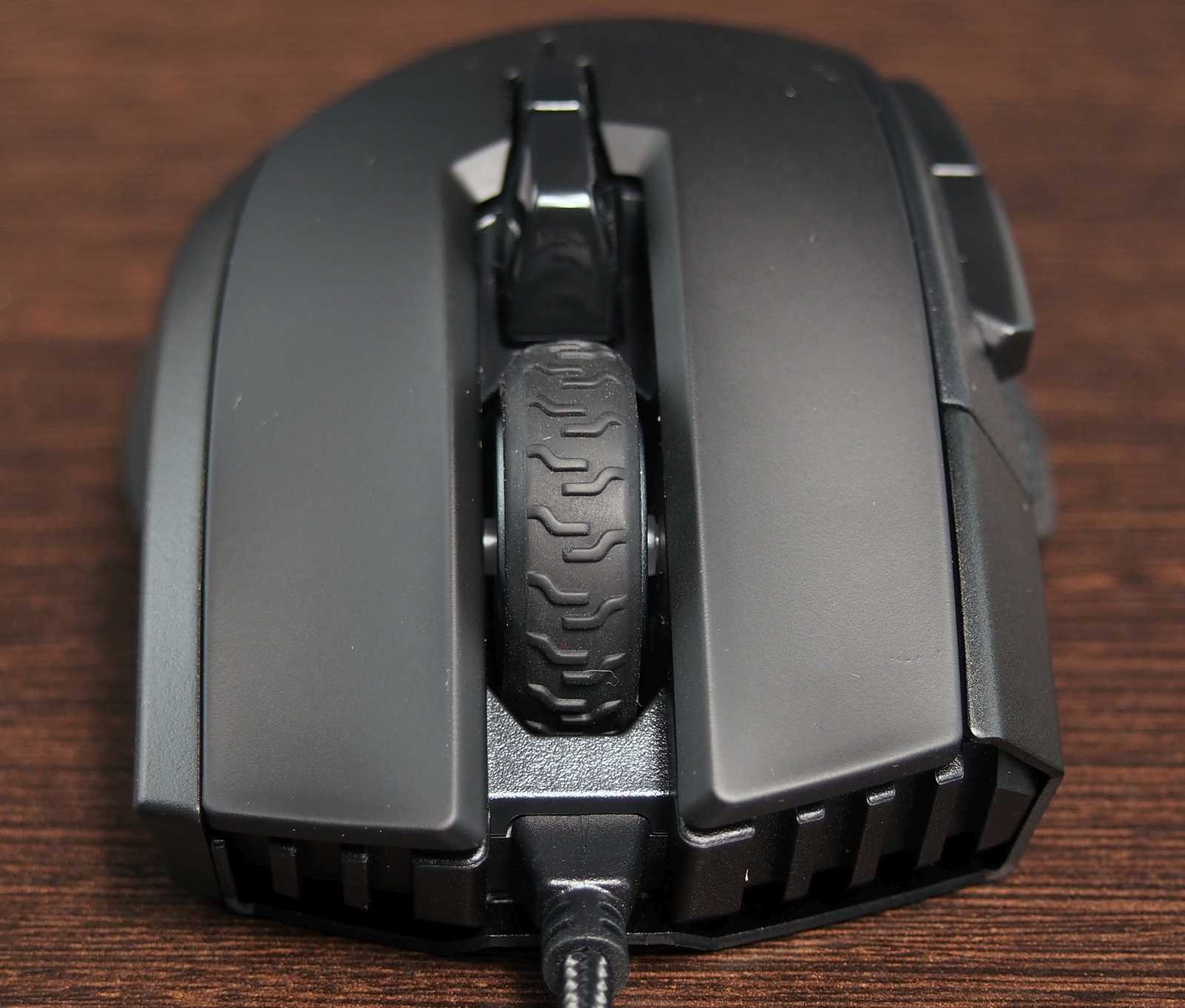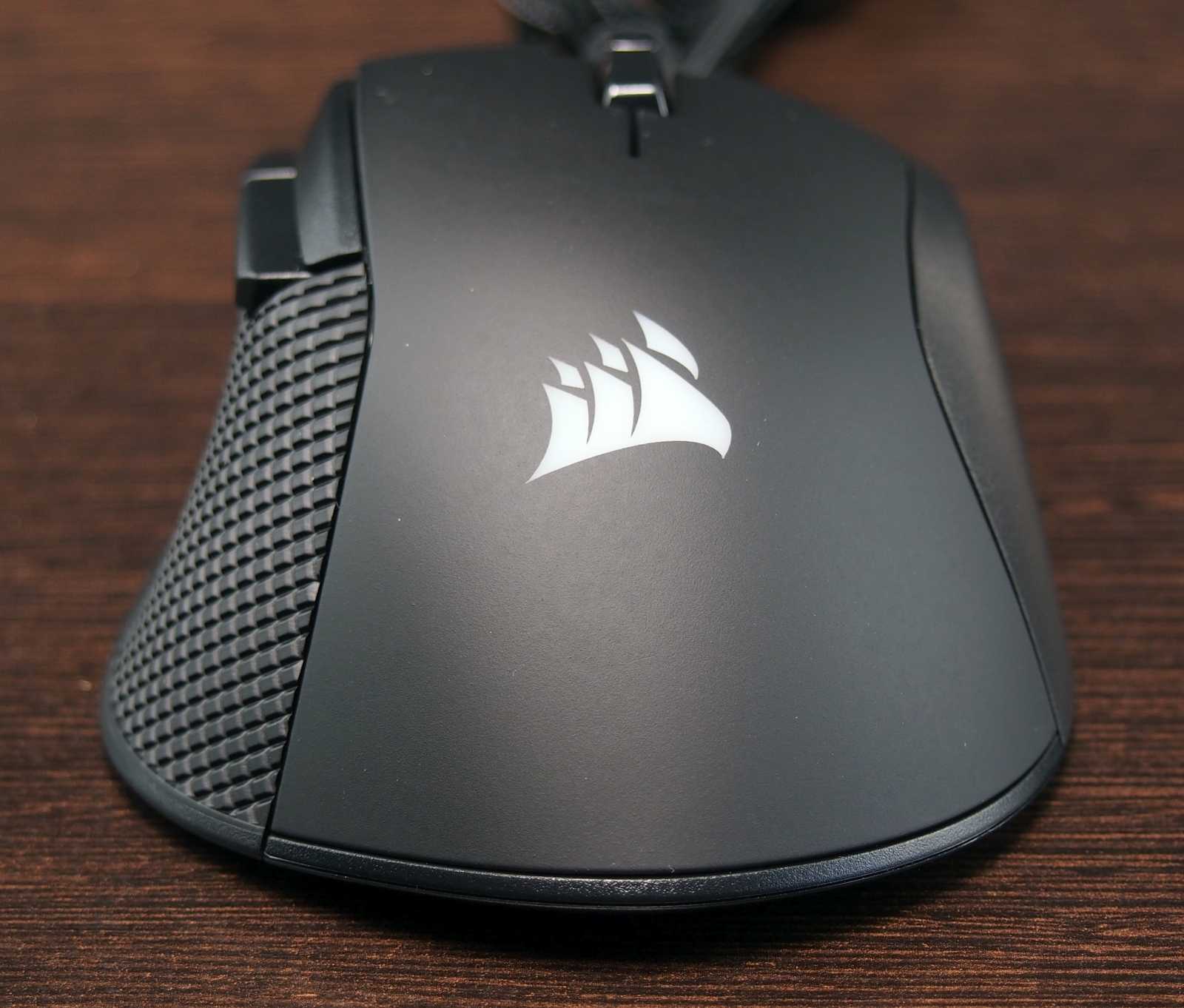 Колесо прокрутки Corsair Ironclaw RGB имеет рифленую поверхность, благодаря которой обеспечивается лучшее сцепление с указательным пальцем и минимизируется проскальзывание. Звук механизма прокрутки умеренно тихий, но с характерными щелчками в позициях фиксации колесика. В области контакта ладони имеется логотип производителя с RGB-подсветкой. Также подсветка в этой модели манипулятора присутствует на колесике мыши и на левой части корпуса в виде трех скошенных линий.