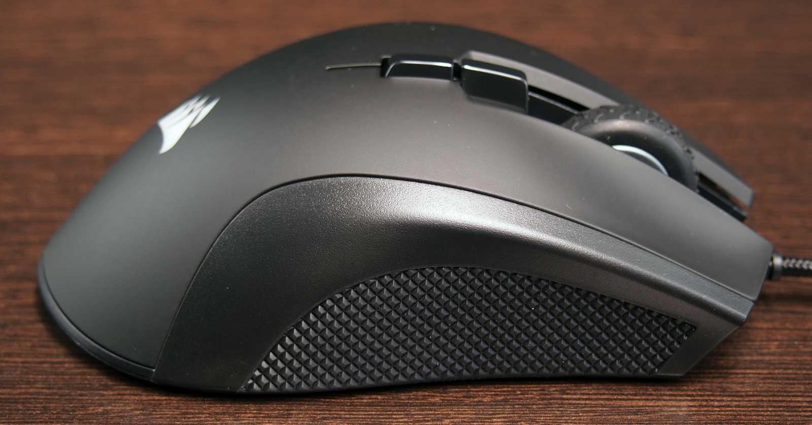 Верхняя часть корпуса Corsair Ironclaw RGB выполнена из софт-тач пластика, который на удивление устойчив к загрязнению. Другие панели мыши сделаны твердого матового пластика. Присутствуют боковые резиновые вставки с ромбовидной фактурой. Левый край манипулятора имеет характерный выступ для большого пальца. Колесико мыши также выполнено с использованием резинового покрытия.