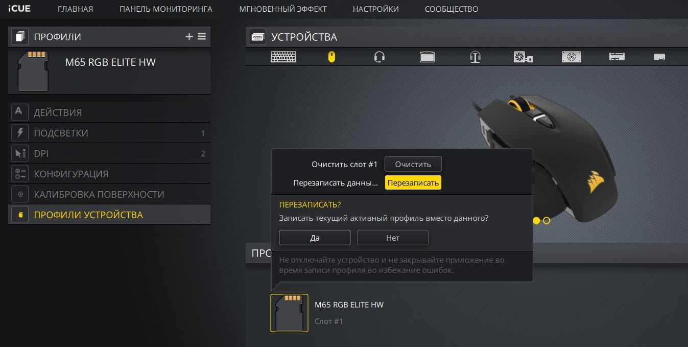 Настроенный нужным вам образом профиль можно сохранить в памяти мышки, и тогда он будет использоваться по умолчанию, если мышь подключать к другому ПК без установленного ПО. На мышке всего один слот для записи профиля.