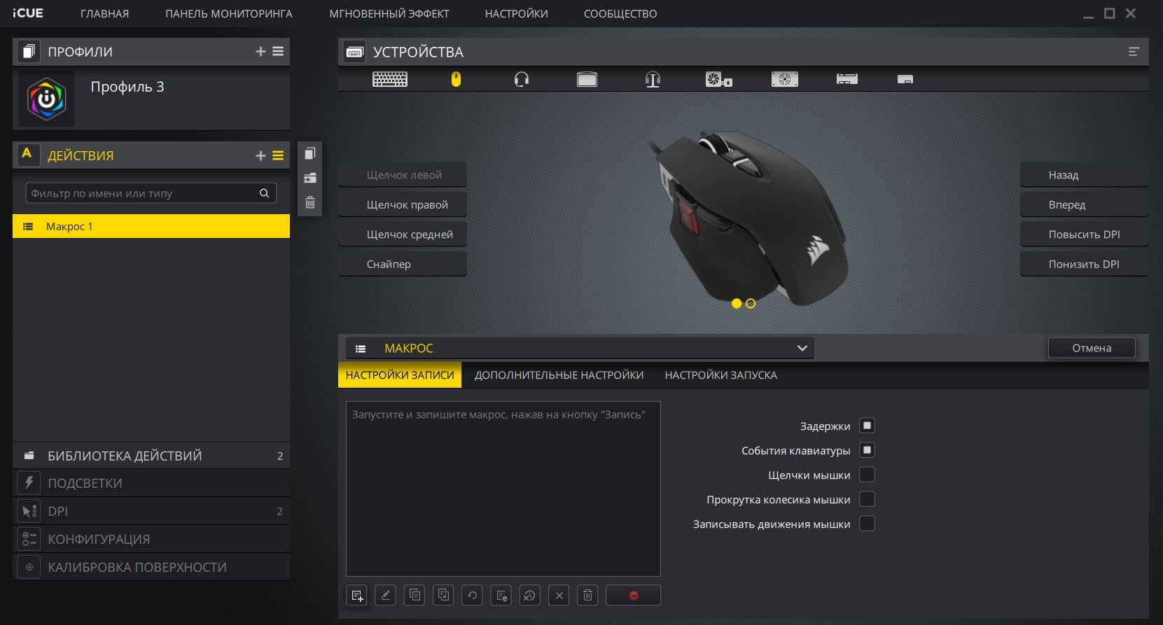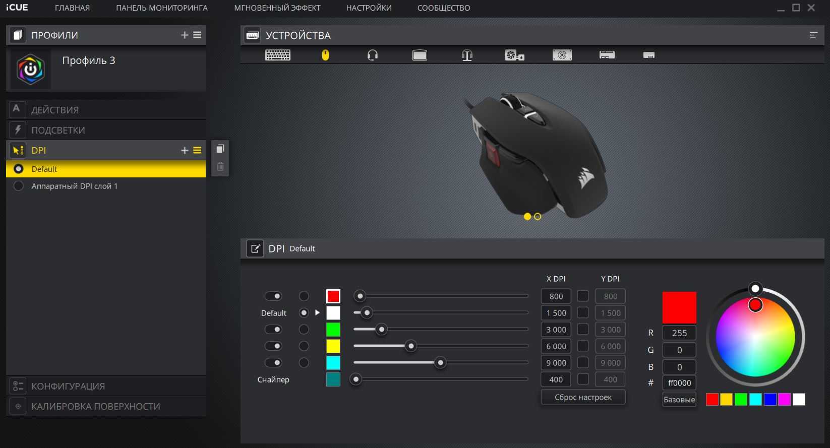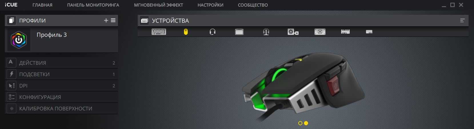 Для настройки мышки используется универсальная утилита Corsair iCUE. Она подходит для настройки и управления всей линейки продукции данного производителя.
