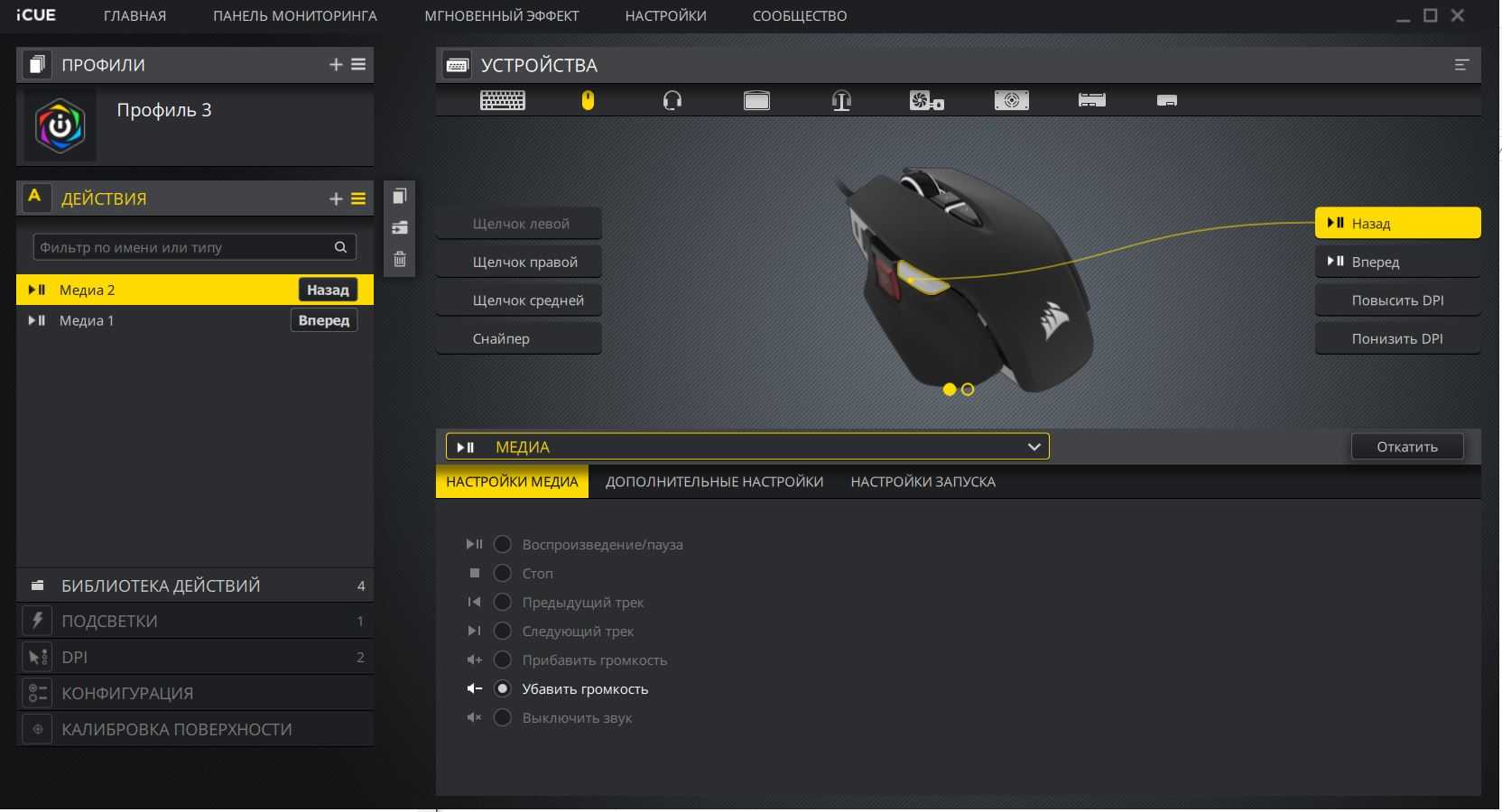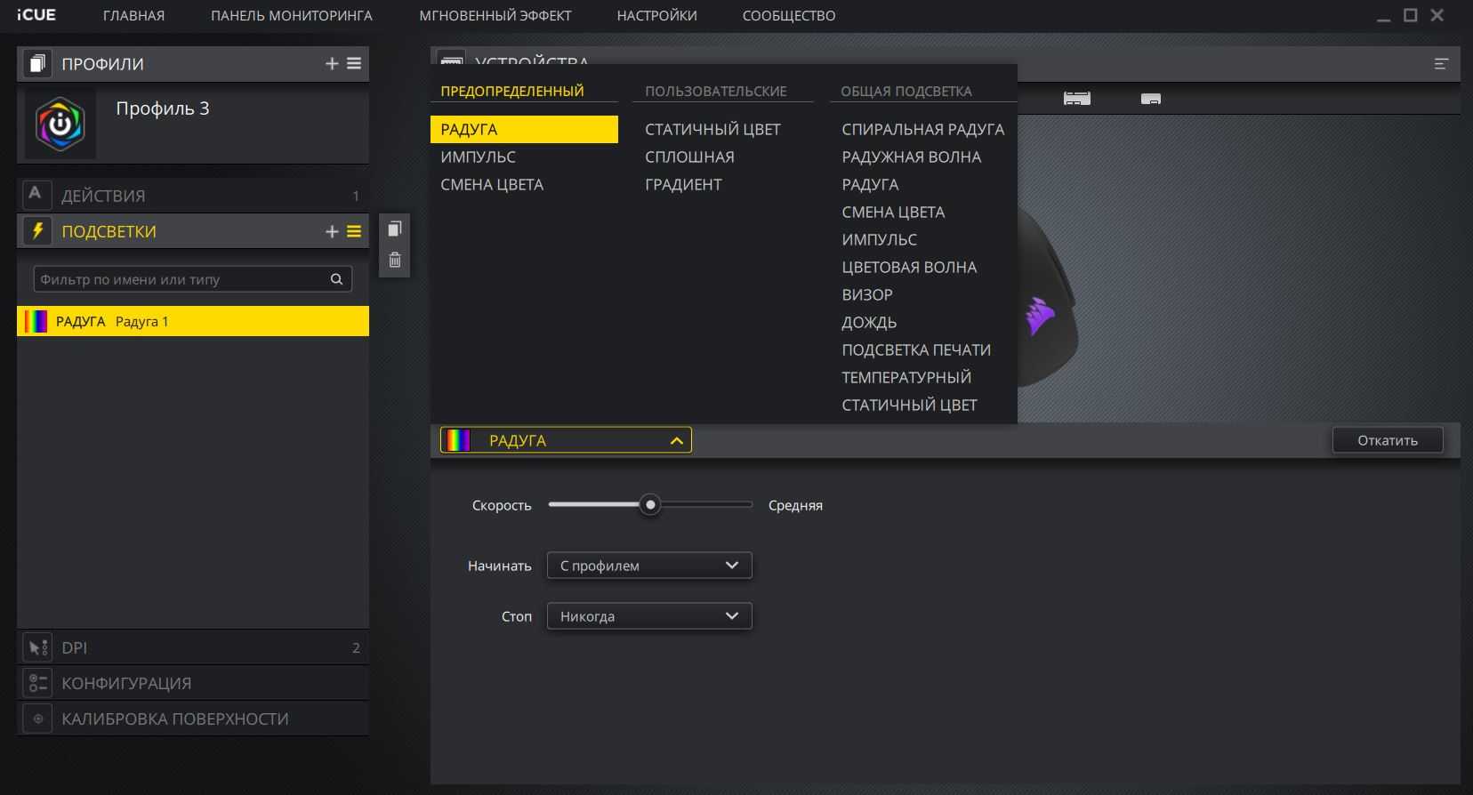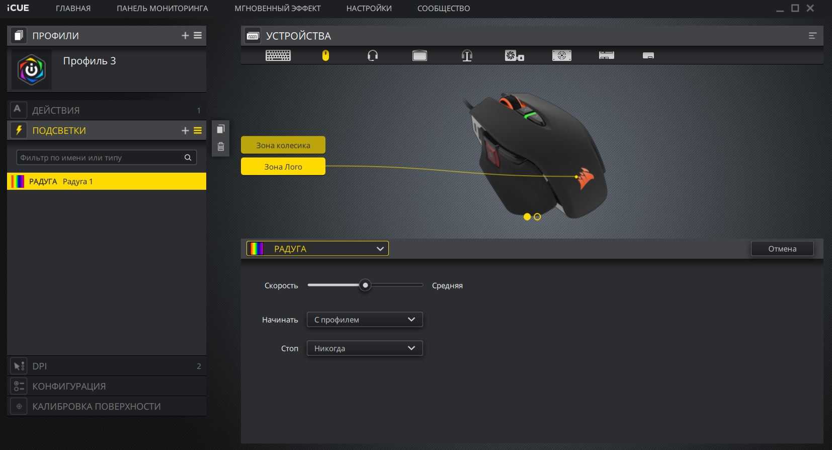 Для настройки мышки используется универсальная утилита Corsair iCUE. Она подходит для настройки и управления всей линейки продукции данного производителя.