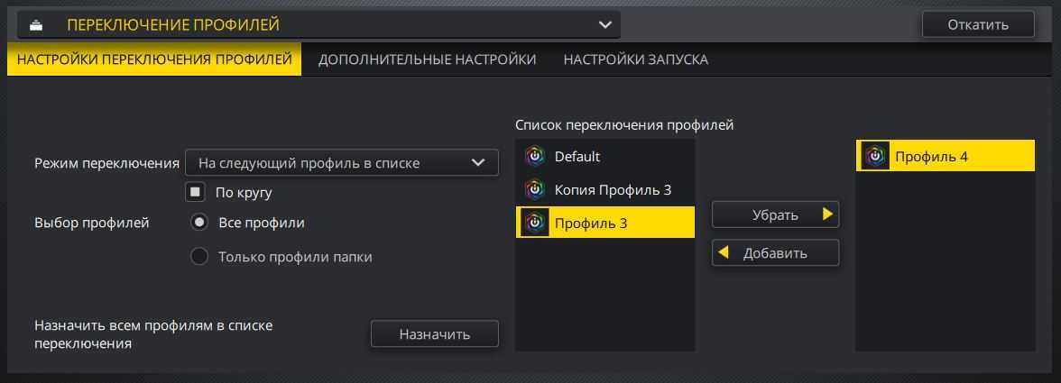 Все настройки выполняются в профилях. Можно сделать несколько профилей и привязать их к событиям или программам.