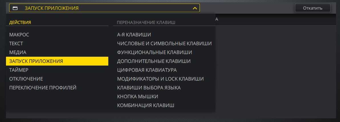 Действия – программирование кнопок и запись макросов. Действия выбираются из списков или записываются пользователем. Возможностей множество — от мультимедийных и переключения профилейдо назначения любой кнопки клавиатуры или их комбинаций.