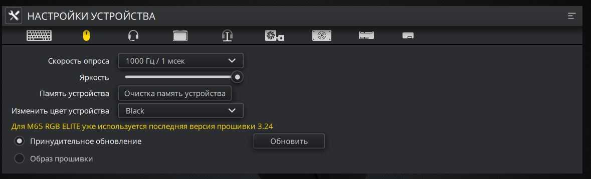 Также имеется вкладка с общими настройками. Через утилиту осуществляется и обновление прошивки мышки, на момент написания материала актуальная версия была 3.24. Здесь же изменяем яркость и скорость опроса, а также очищаем память устройства.