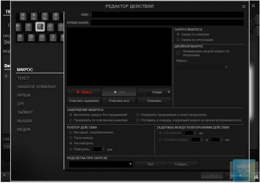 Все функции поделены на несколько разделов, первым рассмотрим «Профили». В пункте «Назначения» происходит настройка функционала клавиш, можно настроить на каждую кнопку абсолютно любое действие. Кроме того, можно записать сложный макрос из длинной последовательности.