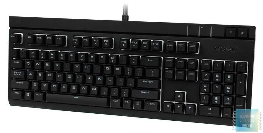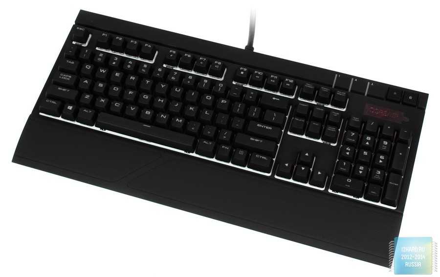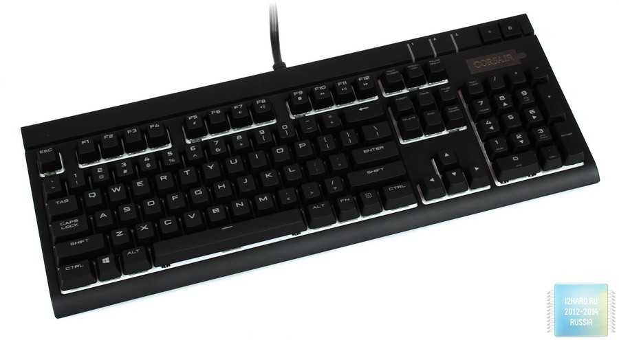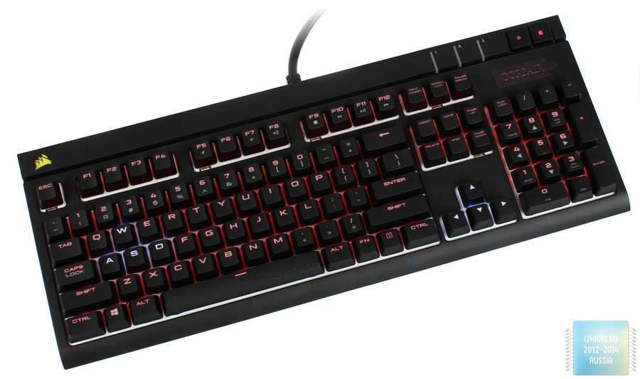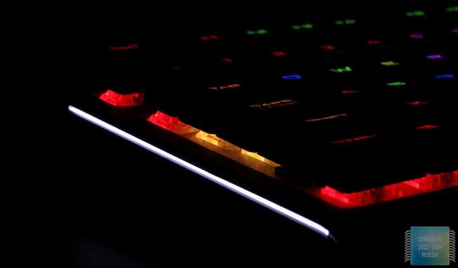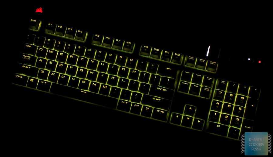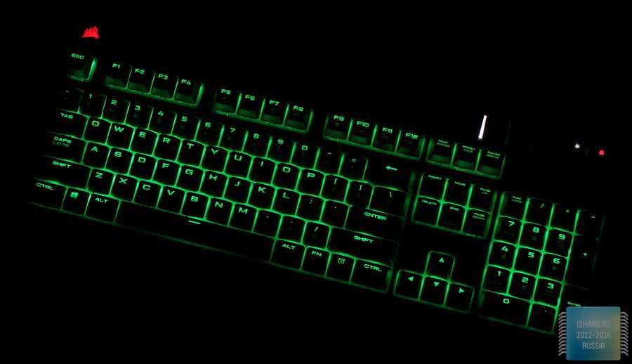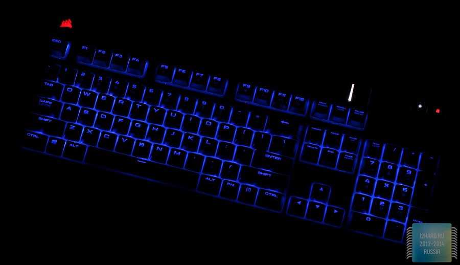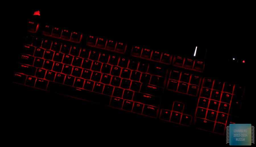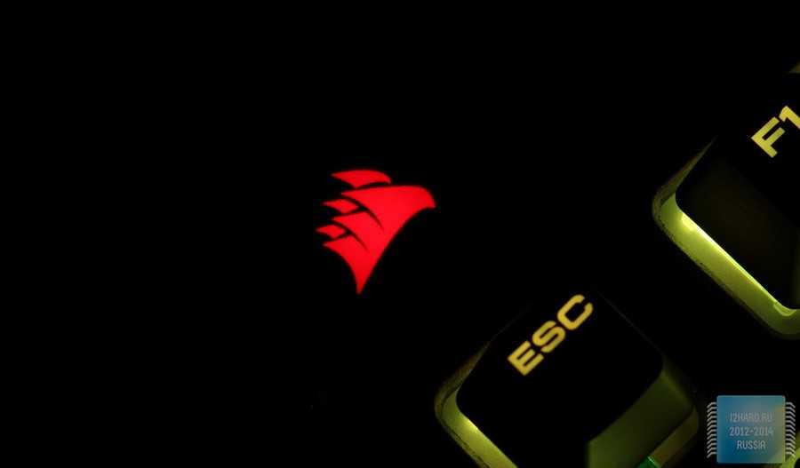Кроме клавиш подсвечиваются и декоративные элементы. В левом верхнем углу логотип Corsair, а по бокам клавиатуры полоса по всей ширине корпуса. Выглядит очень эффектно, за подсветку однозначный плюс.