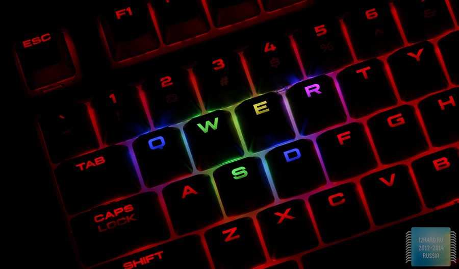 Как уже упоминалось, клавиатура полноразмерная со стандартным числом клавиш. Раскладка традиционная, блок с дополнительными клавишами отсутствует. Сразу же хочется отметить, что и левый и правый Shift очень длинные, но есть нюанс, в наших руках оказалась клавиатура без русской раскладки, ориентированная на американский рынок, как будет в нашей локализации неизвестно, но надеемся, что точно также. Кнопка Enter также длинная, но «одноэтажная», кому-то может быть не удобно. Пробел с ребристой структурой, палец по немуне проскальзывает, нажимается равномерно с любой стороны. Вместо дополнительных кнопок производитель сделал ряд клавиш с двойным назначением. F5-F12 кроме основного функционала выполняют ещё и мультимедийные функции, такие как переключение трека, регулировка звука и так далее. Для выполнения этих функций кнопку нужно нажимать вместе с FN, которая расположилась в нижней части вместо одной из кнопокWin. Кстати, о Win, клавиатура наделена так называемым игровым режимом, при котором отключается эта самая кнопка, нужно это для того, чтобы случайно во время игры не задеть её и не свернуть экран. Для активации этого режима нужно нажать кнопку в правой верхней части, на которой изображён замочек с логотипом Windows. Что касается украшательств, логотип производителя из хромированных букв находится прямо над цифровым блоком, он не подсвечивается, а вот фирменный значок, который можно увидеть при включении подсветки в левом верхнем углу, имеет полноцветный диапазон свечения.