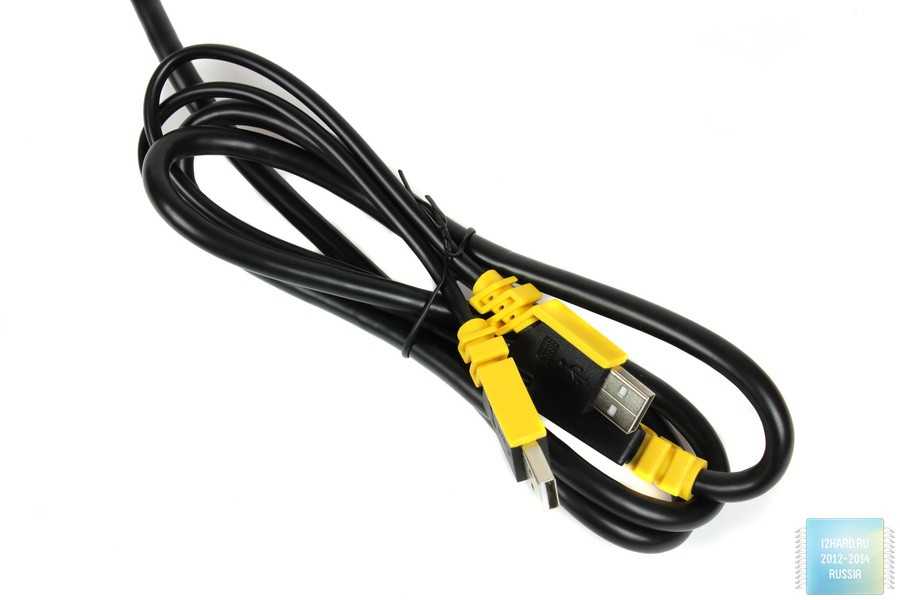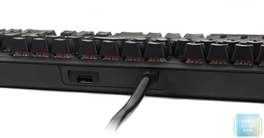 Не обошлось и без обязательного атрибута дорогих клавиатур — USB-хаба, он расположился на заднем торце, прямо рядом с кабелем. Производитель решил ограничиться всего одним портом. Скорость соответствует стандарту USB 2.0, порт вполне подходит для использования с флешками.