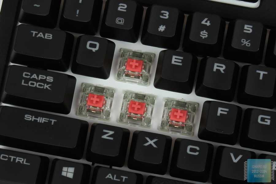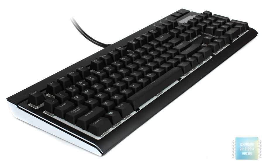Итак, в данной клавиатуре используются новейшие переключатели от компании Cherry под названием MX Silent. По сути они являются теми же MX Red, но с модификациями, которые понизили уровень шума при нажатии. Как заявляет сам Corsair, эти свичи на 30% тише чем традиционные MX Red, не веритьне видим смысла, они, действительно, тише, причём ощутимо. Достичь этого удалось за счёт использования интегрированных двухкомпонентных кулачков, а также специальной формы компонентов, которая способствует понижению звука от «клацанья» клавиш на верхней и нижней гранях. Теперь шум механической клавиатуры довольно близок по значению с обычной мембранной. Нельзя не заметить и изменение в направляющих клавиш, при нажатии они движутся чуть более плавно, без рывков.