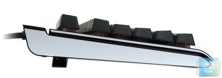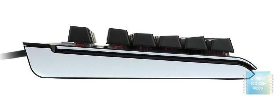 Ещё одной особенностью интерьера STRAFE RGB является наличие вставок из белого пластика. Их производитель расположил на торцах корпуса, никакого практического смысла в этом нет, просто декоративный элемент. Если приглядеться, то между этими вставками можно заметить полосу из прозрачного пластика, это один из элементов, который делает подсветку более эффектной создавая иллюминацию не только на лицевой стороне клавиатуры, но и по бокам. На саму реализацию подсветки посмотрим чуть позже.
