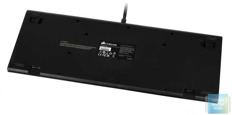 Нижняя часть из аналогичного матового пластика. Кроме неинтересных информационных наклеек тут есть четыре резиновых ножки для предотвращения скольжения клавиатуры, они, кстати, вполне работают, даже на скользком столе STRAFE RGB стоит неподвижно, этому способствует ещё и немалый вес.Пара ножек для установки клавиатуры под углом на своём традиционном месте, выглядят они не особо надёжно, маленькие и низкие