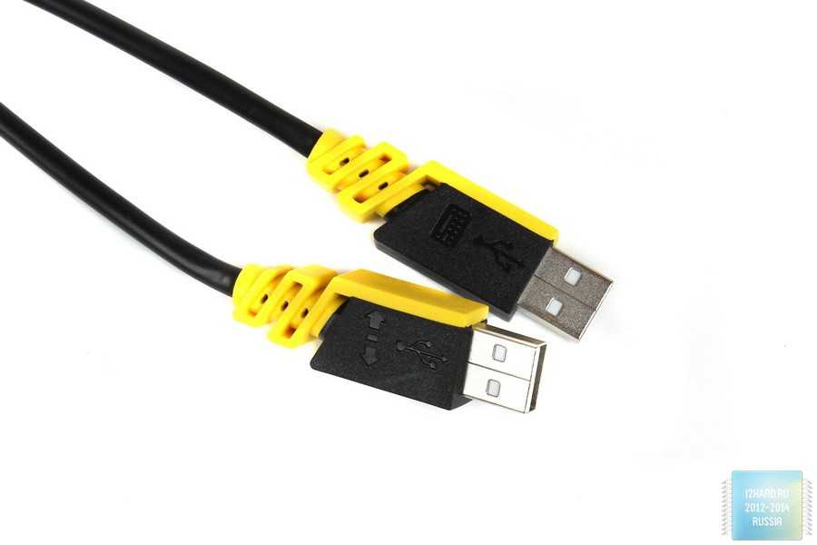 Теперь несколько слов о кабеле. Он очень толстый и не особо гибкий, с одной стороны это говорит о качестве и долговечности, а с другой не самым положительным образом влияет на удобство. На столе такой кабель выглядит не особоэстетично. К тому же, тканевая оплётка отсутствует. На кабеле имеется два разъёма USB, один отвечает за подключение клавиатуры, а второй за USB-хаб. Примечательно, что разъёмы не позолоченные.
