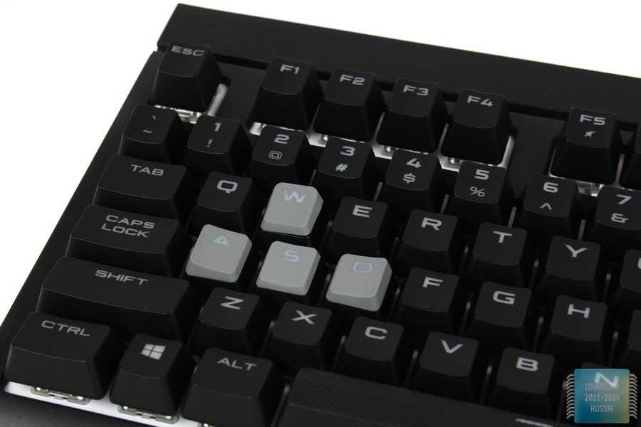 Пару слов и о дополнительных кейкапах. Они специально адаптированы под игры, имеется два набора WASD и QFER. На верхней части нанесена резиновая прокладка для лучшего сцепления с пальцем, форма также немного изменена, что видно на фото. Играть с ними, действительно, удобнее. При этом символытакже присутствуют и подсветка такого же качества.