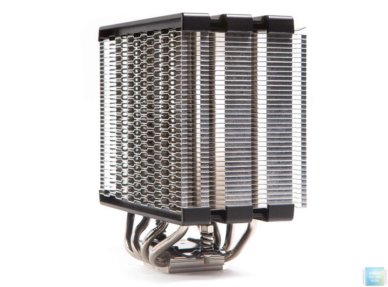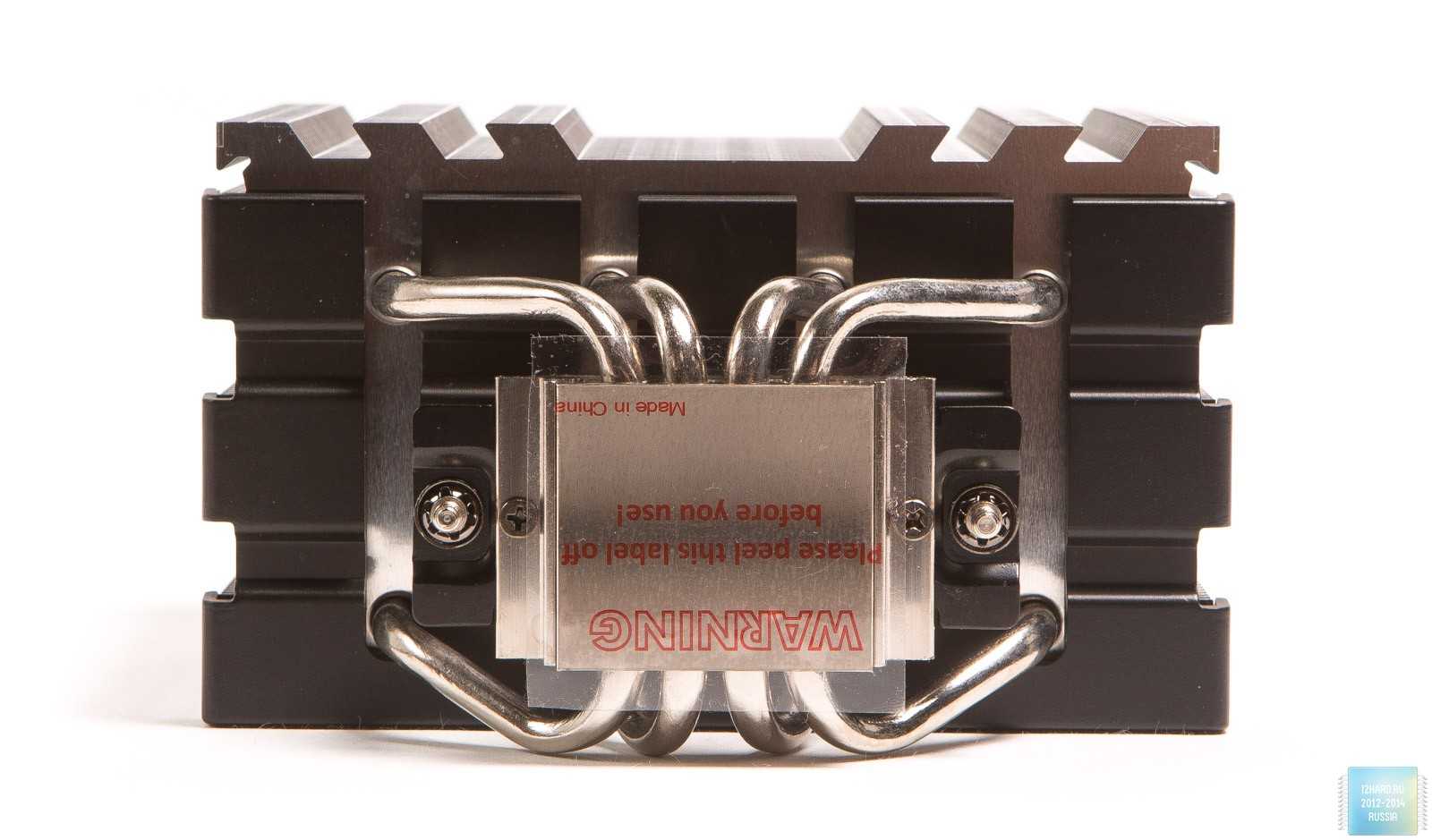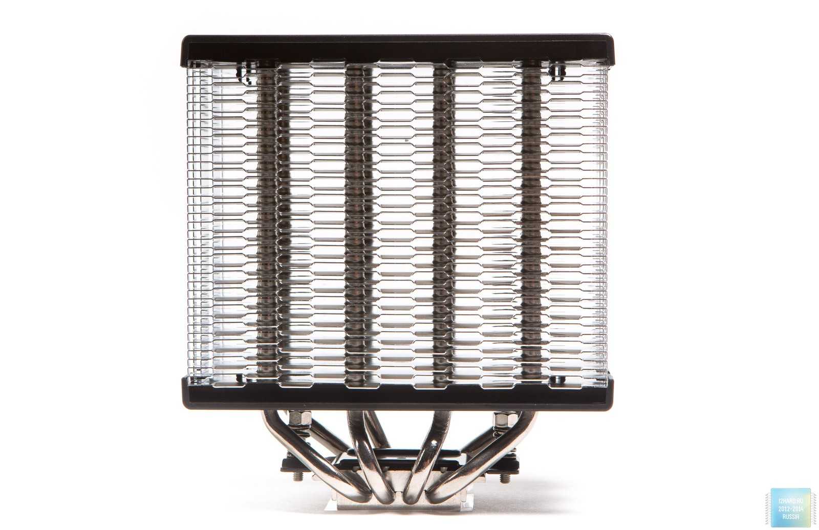 В конструкции используются 39 широких алюминиевых пластин, насаженных на тепловые трубки. Расстояние между пластинами равно 2,8мм, это позволит использовать вентиляторы с невысоким уровнем статического давления. Верхняя и нижняя пластины закрыты пластиковыми накладками.
